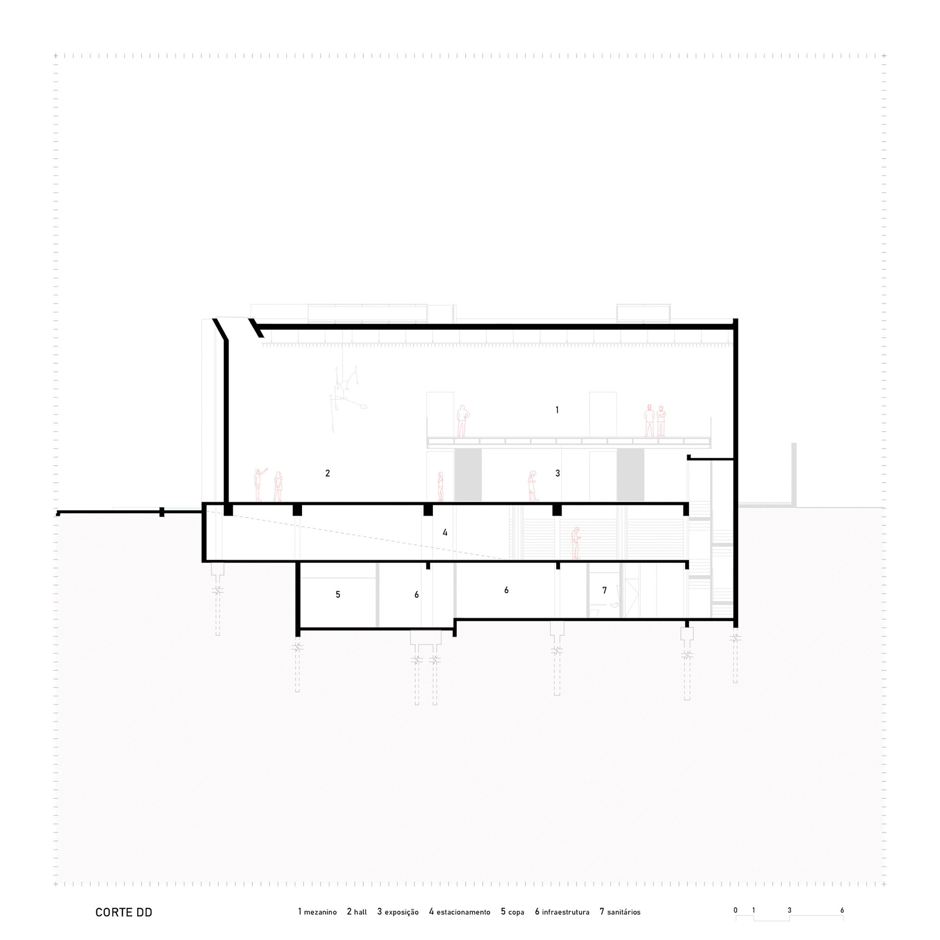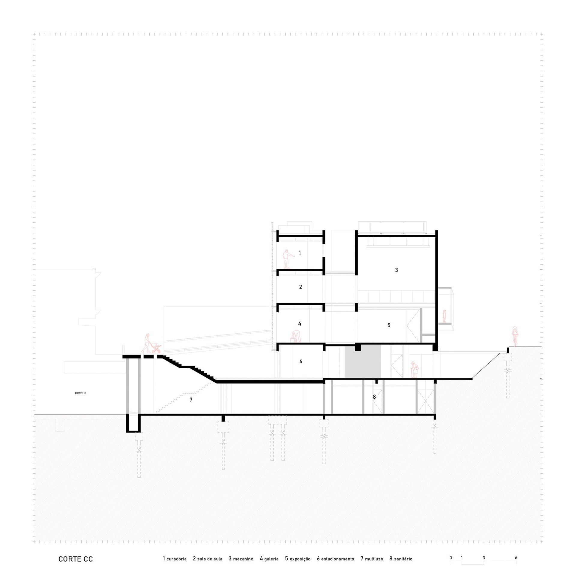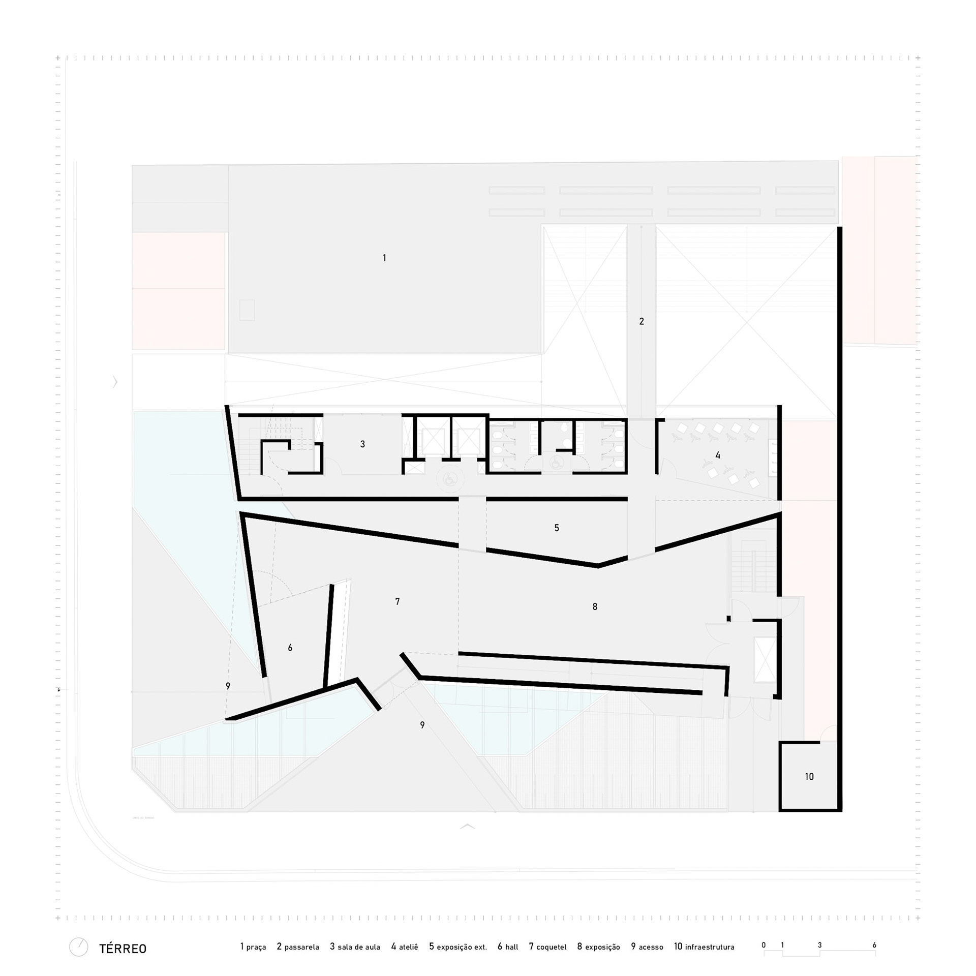 The ramp projecting outwards is a political gesture: a pause suspended over the sidewalk, a moment of contemplation of the historic Liceu de Artes e Ofícios. The public square articulates the building with the city, allowing art to spill over the limits of the walls. Reinforced concrete here demonstrates its plastic and social vocation: malleable to create the bold form, rigid to guarantee the permanence of culture in the urban space.
