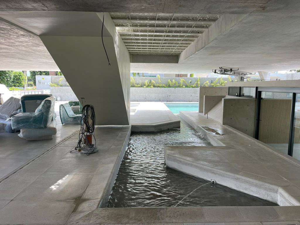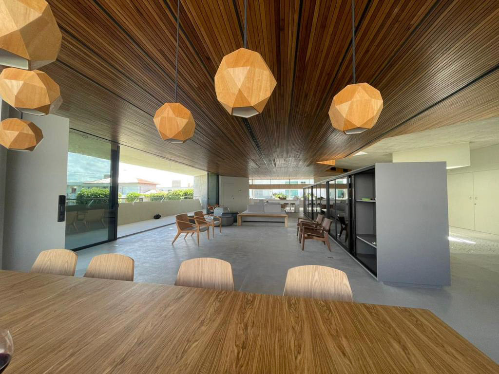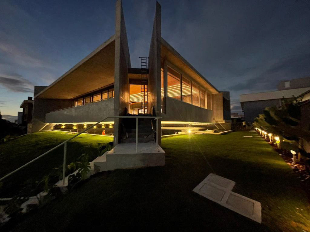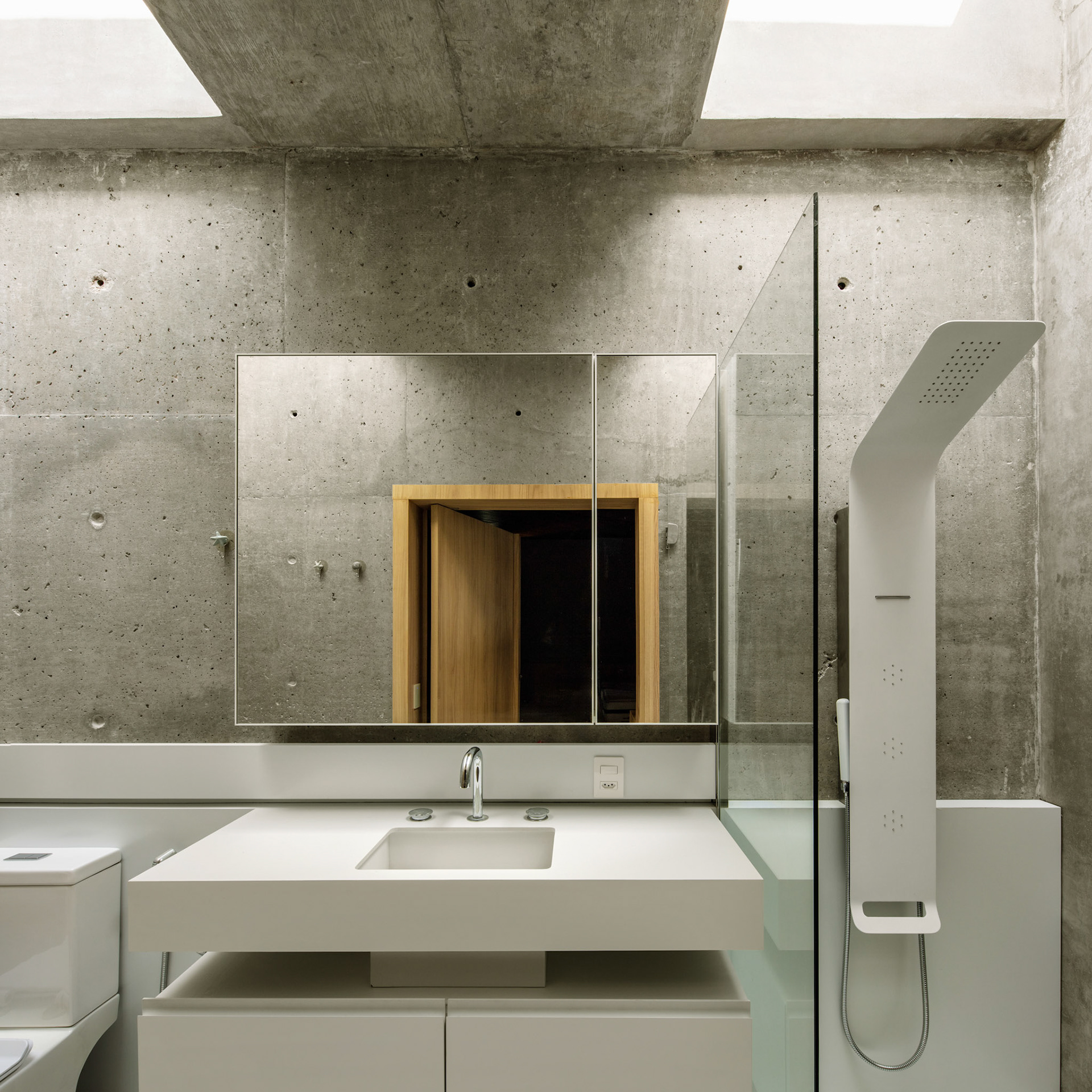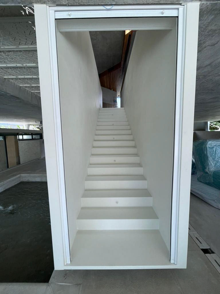 The result is a slender monolith that appears to hover over the site, resting with the delicacy of someone landing — like the foot of a ballerina in balance. The common and social area occupies the ground floor, fluid and transparent; the private program is elevated to the first level, secluded and panoramic, separating uses and ensuring visual amplitude over the surroundings. The structural concrete protections ensure the viability of this technical feat, reaffirming the power of the material as an expressive and structural element.