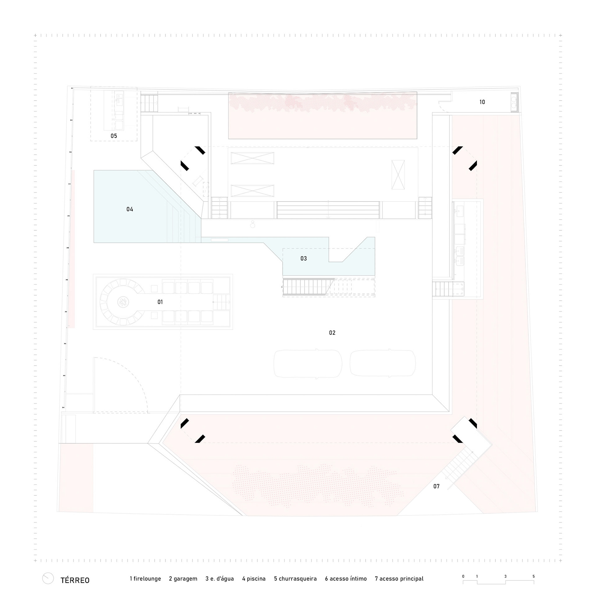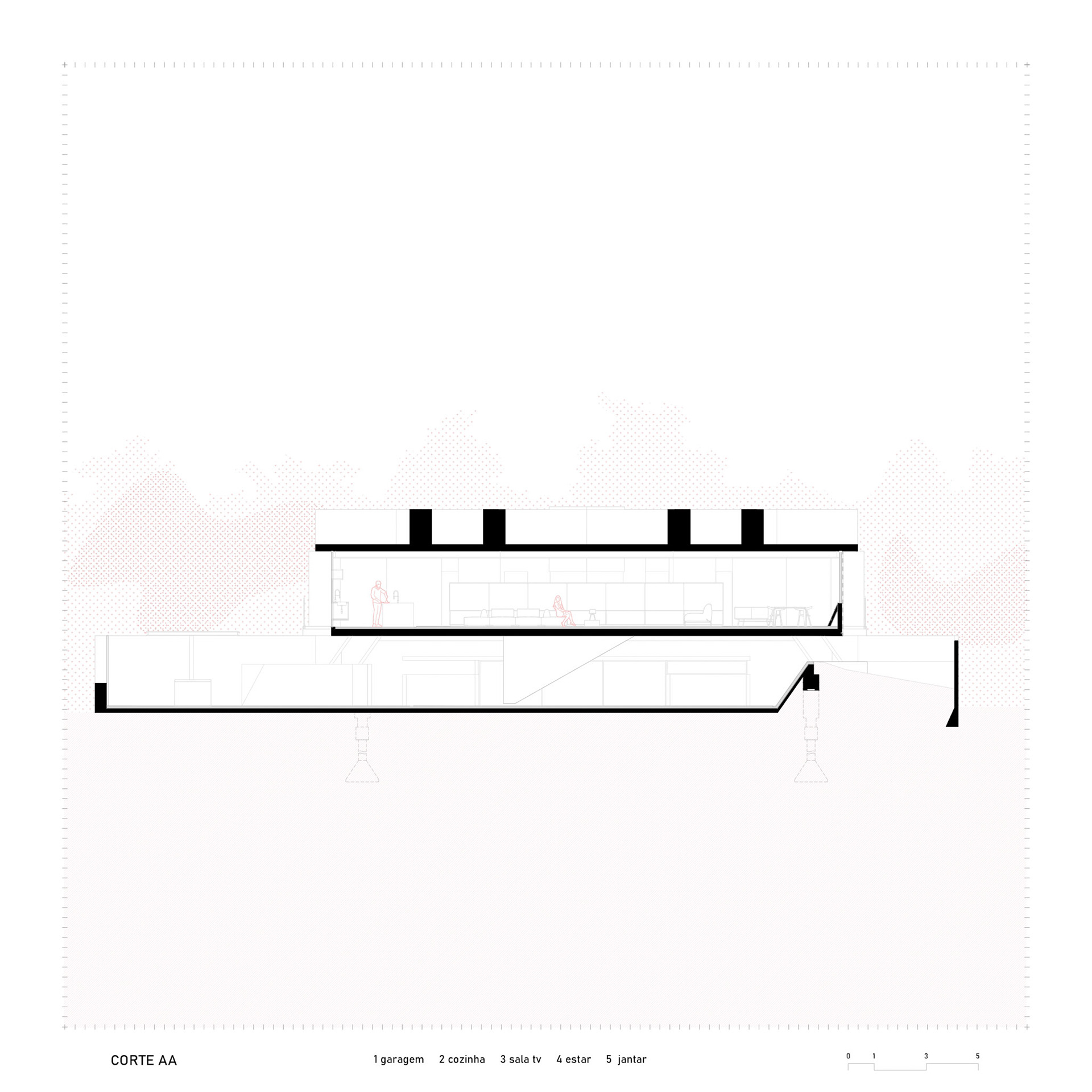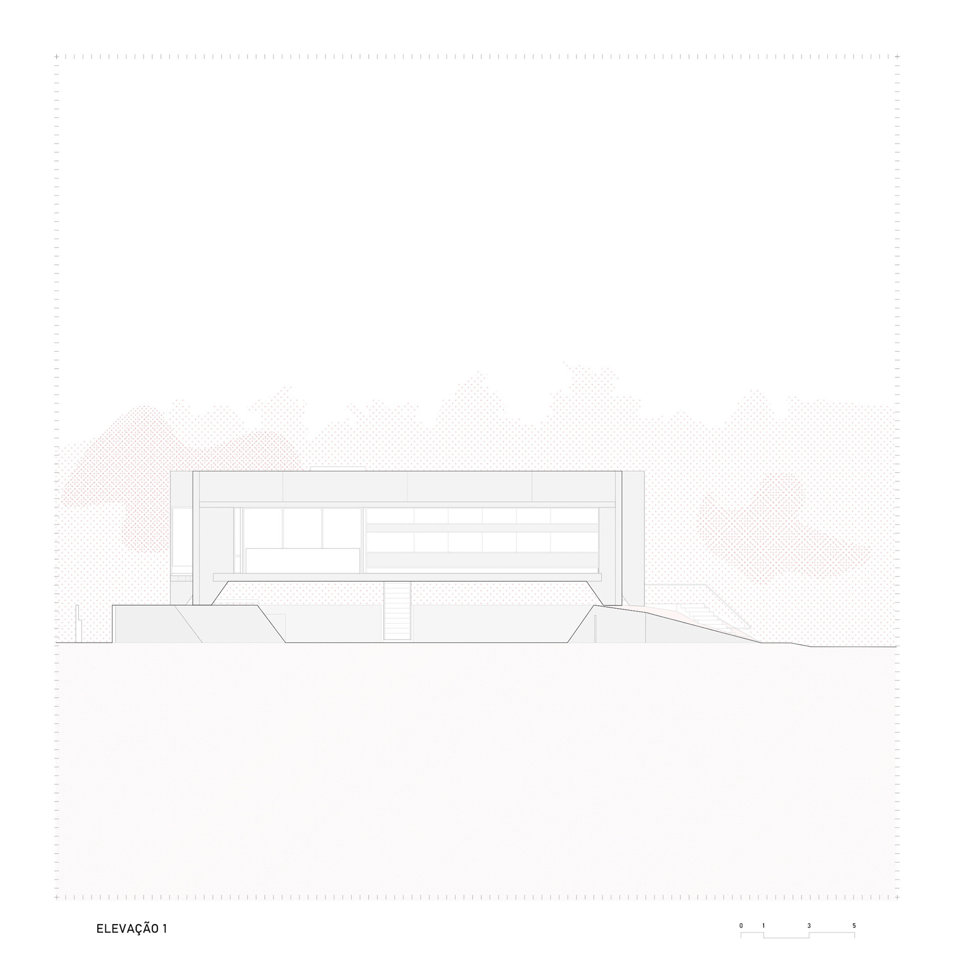 A parte comum e de convívio ocupa o térreo, fluido e transparente; o programa social eleva-se ao primeiro nível, resguardado e panorâmico, separando usos e garantindo amplitude visual sobre o entorno.As proteções estruturais em concreto armado asseguram a viabilidade dessa façanha técnica, reafirmando a potência do material como elemento expressivo e estrutural.