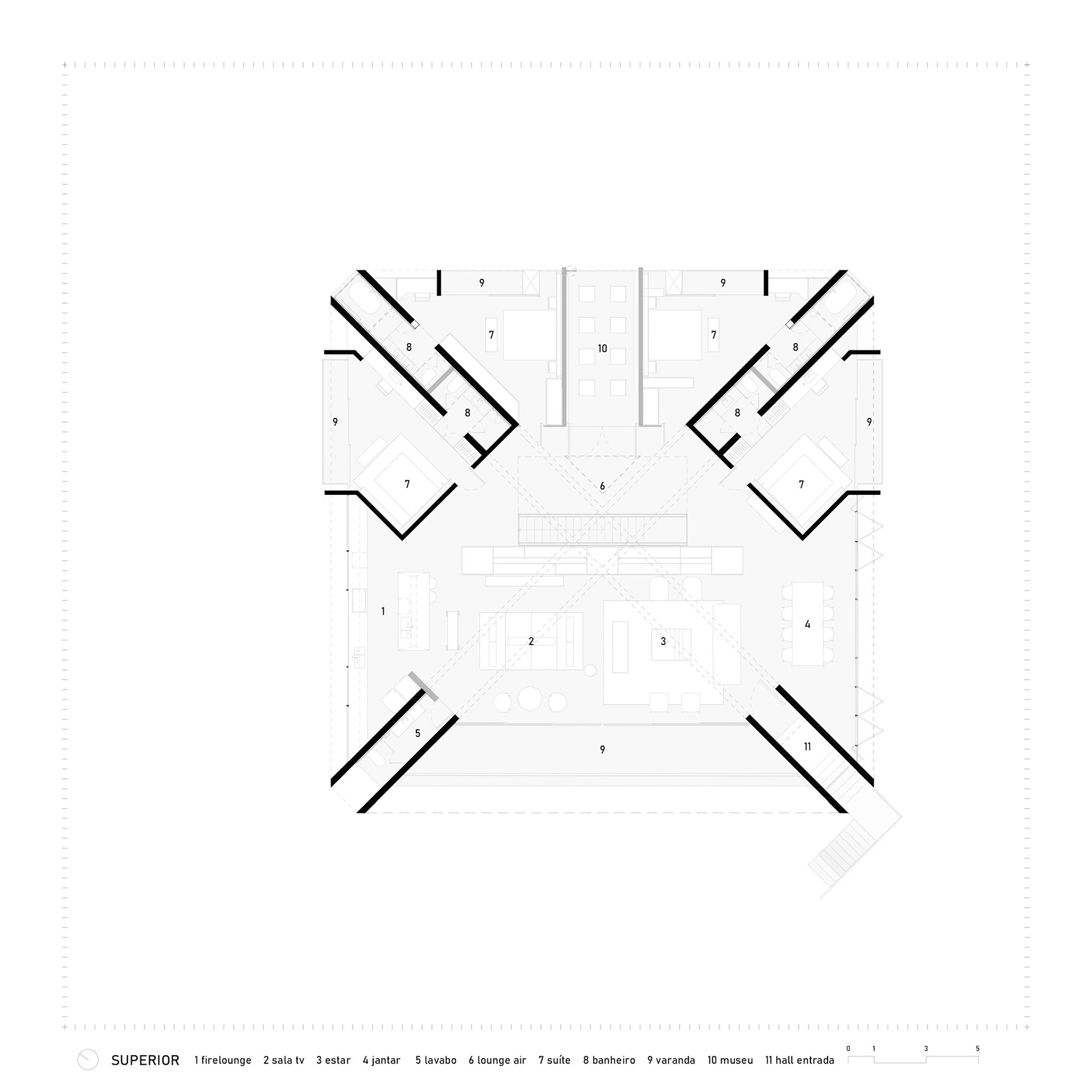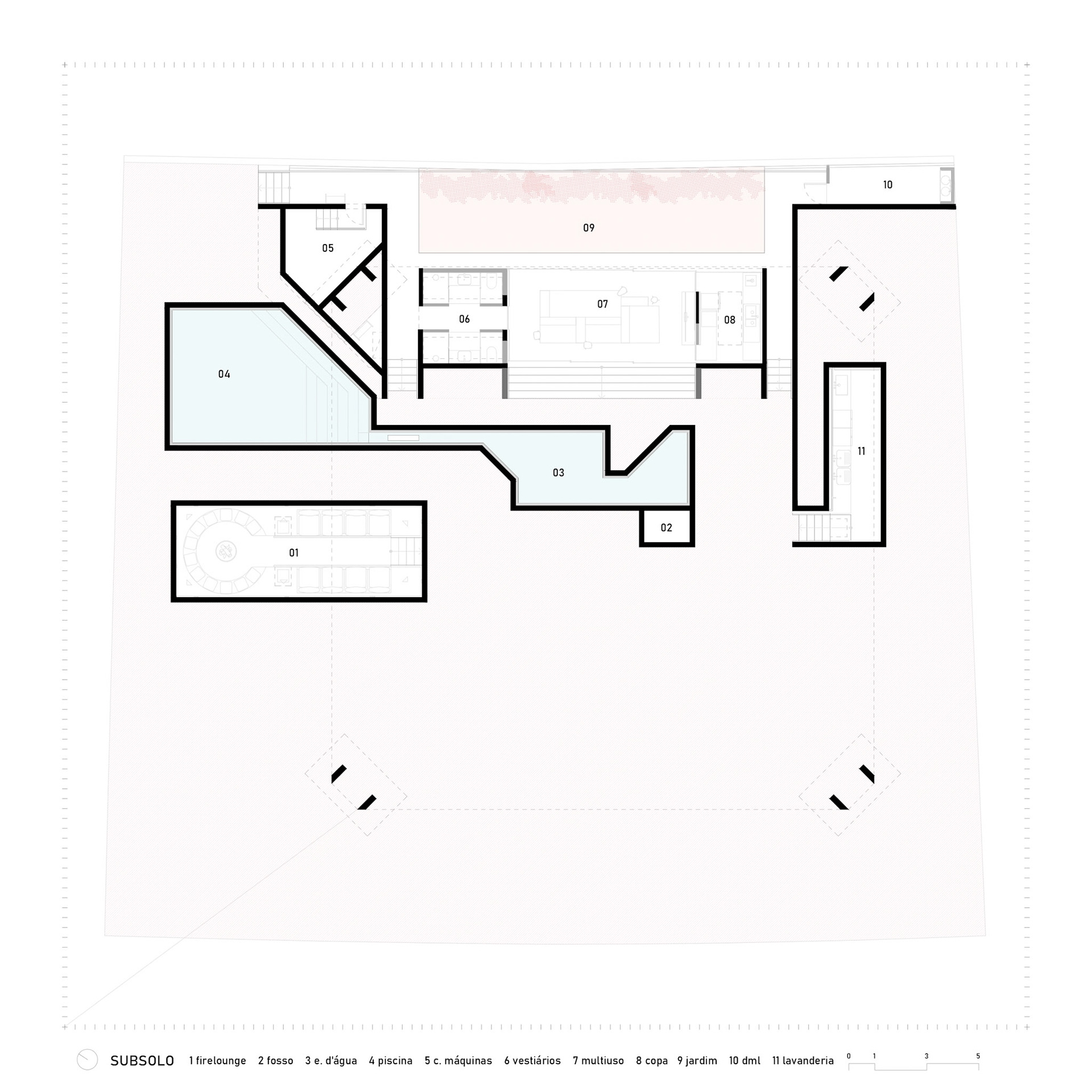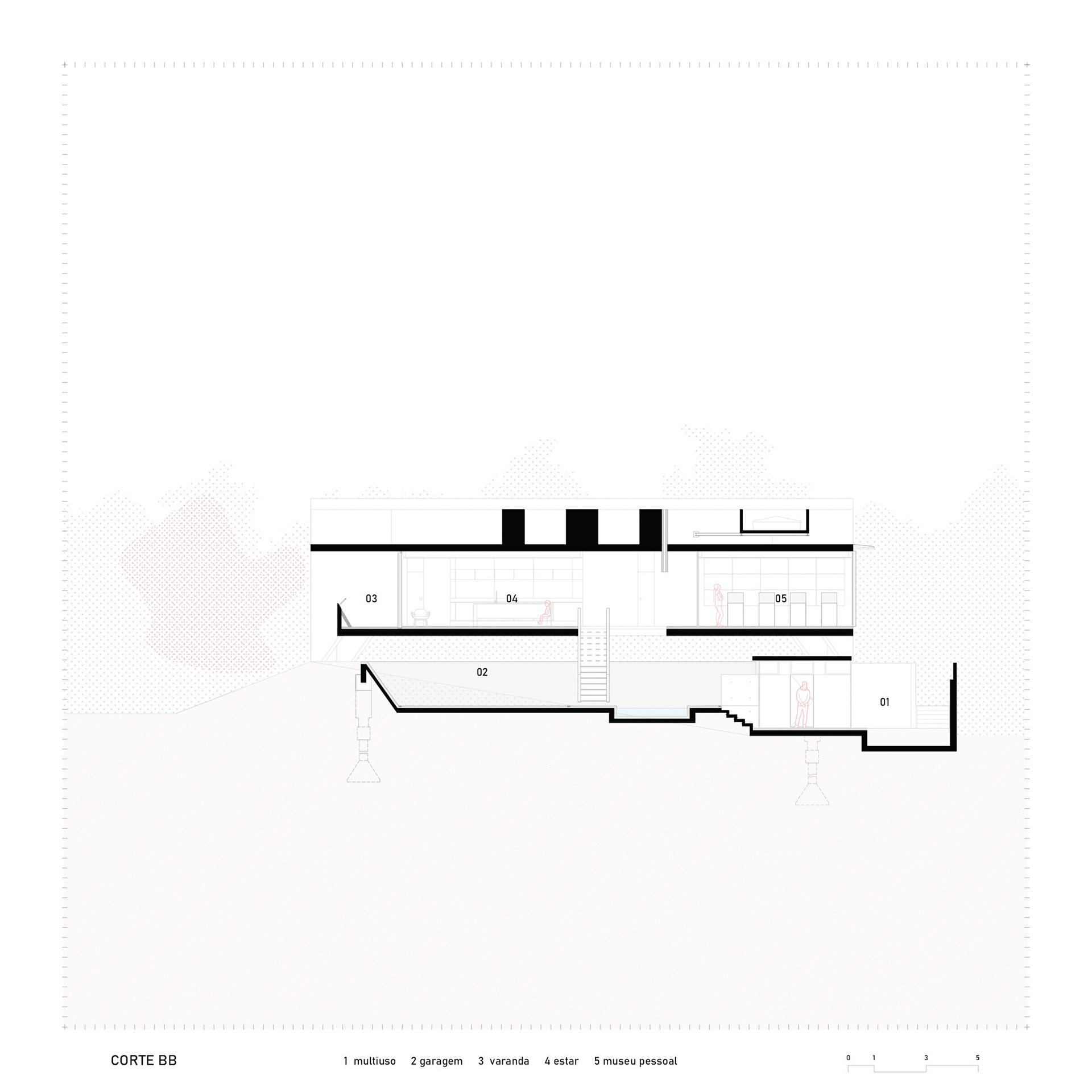 A parte comum e de convívio ocupa o térreo, fluido e transparente; o programa social eleva-se ao primeiro nível, resguardado e panorâmico, separando usos e garantindo amplitude visual sobre o entorno.As proteções estruturais em concreto armado asseguram a viabilidade dessa façanha técnica, reafirmando a potência do material como elemento expressivo e estrutural.