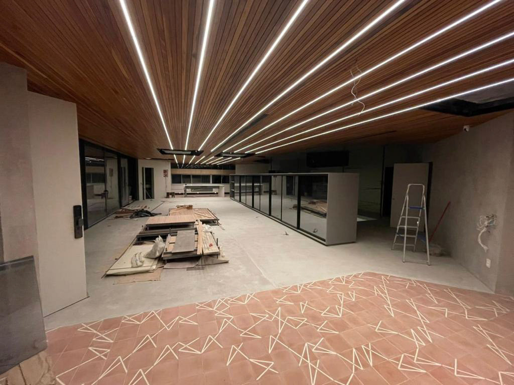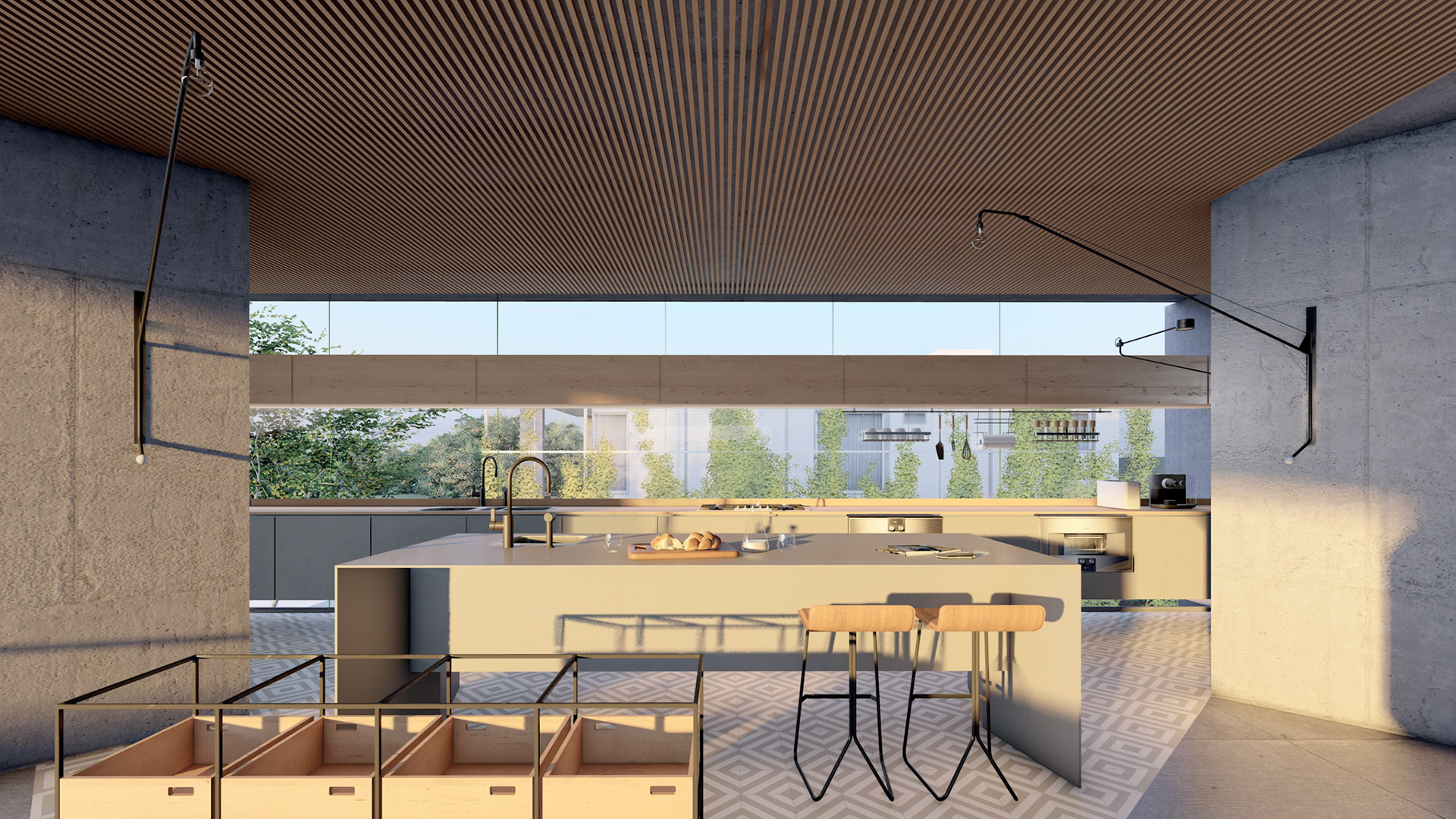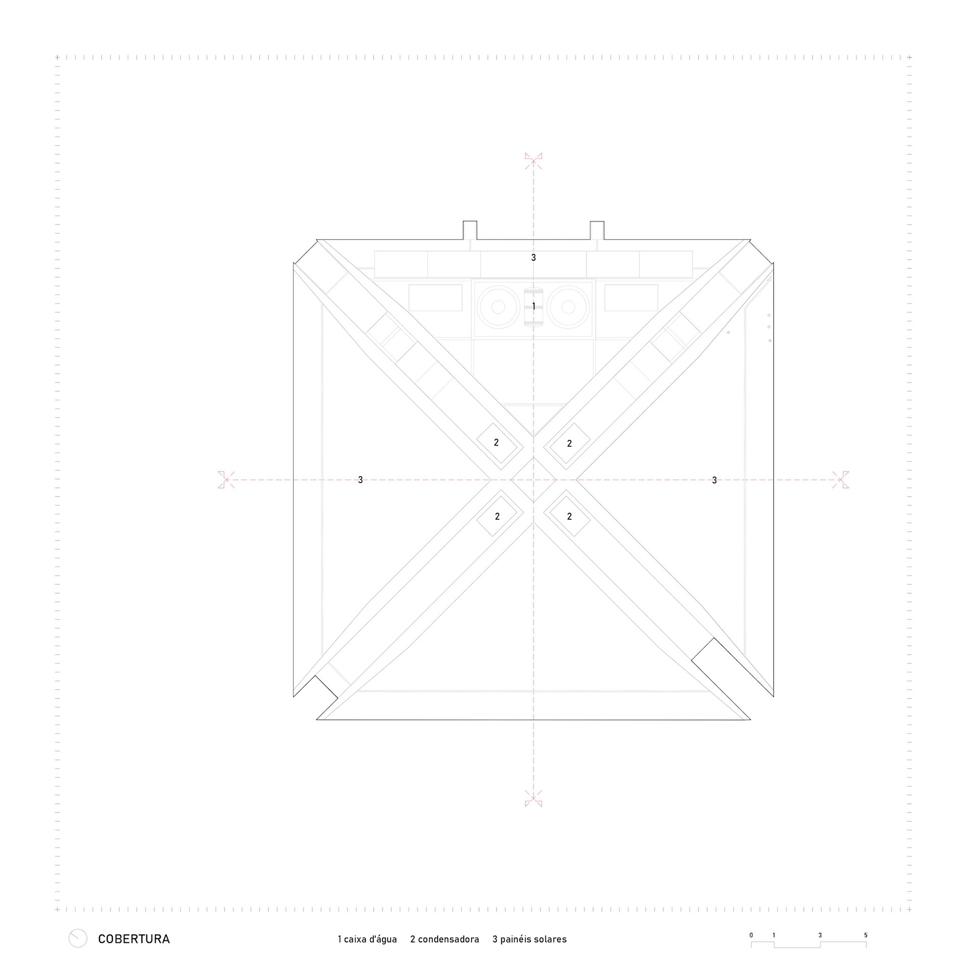 A solução estrutural nasce de um sistema em “X” duplo, uma geometria não convencional que reduz a altura das vigas e integra os elementos hidráulicos nas paredes paralelas formadas por esse desenho.