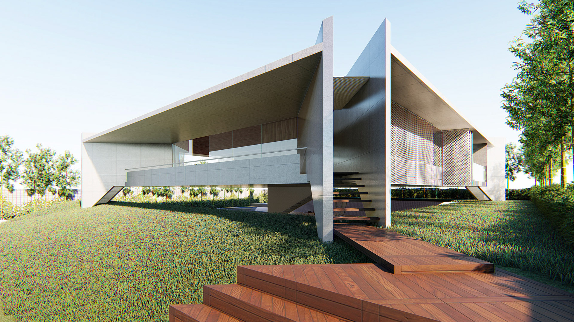 A casa HaveBlue, surge um desafio estrutural que se transforma em premissa de projeto. Nesta residência, o desejo do cliente por um térreo livre e com poucos apoios conduziu à criação de uma casa cuja estrutura se torna o próprio gesto arquitetônico — um volume suspenso que, ao mesmo tempo, revela e sustenta a sua leveza.