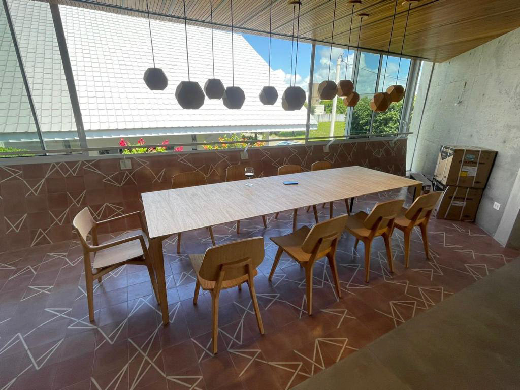A parte comum e de convívio ocupa o térreo, fluido e transparente; o programa social eleva-se ao primeiro nível, resguardado e panorâmico, separando usos e garantindo amplitude visual sobre o entorno.