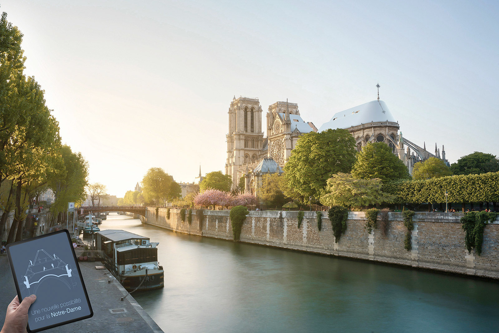 O DIÁLOGO ENTRE A CIDADE DE PARIS E A CATEDRAL DE NOTRE DAME, É UM GESTO CONTIDO NA INTERVENÇÃO DE PROJETO DA COBERTURA, QUE AGORA PASSA A REFLETIR PARA O POVO O CÉU PARISIENSE, COMO UMA FORMA DE REFLEXÃO POR TODOS ESTES ANOS VIVENCIADO SOB O CEU DESTA CIDADE ÚNICA. APESAR DE SER A RECONSTRUÇÃO DA COBERTURA, A TÉCNICA CONSTRUTIVA E A MATERIALIDADE FORAM PENSADAS A PARTIR DA TECNOLOGIA ATUAL, COM É O CASO DO INOX POLIDO, UM METAL LEVE, USADO COMO REVESTIMENTO DO TELHADO QUE CONSEGUE PASSAR EM UM PRIMEIRO MOMENTO, DISCRETAMENTE NA PERSPECTIVA DO HORIZONTE DA CIDADE, ALÉM DE CONTRIBUIR PARA NÃO ACRESCENTAR NADA, APENAS A IMAGEM DO CÉU, COMO UM ESPELHO NO HORIZONTE MONOCROMÁTICO DE PARIS.