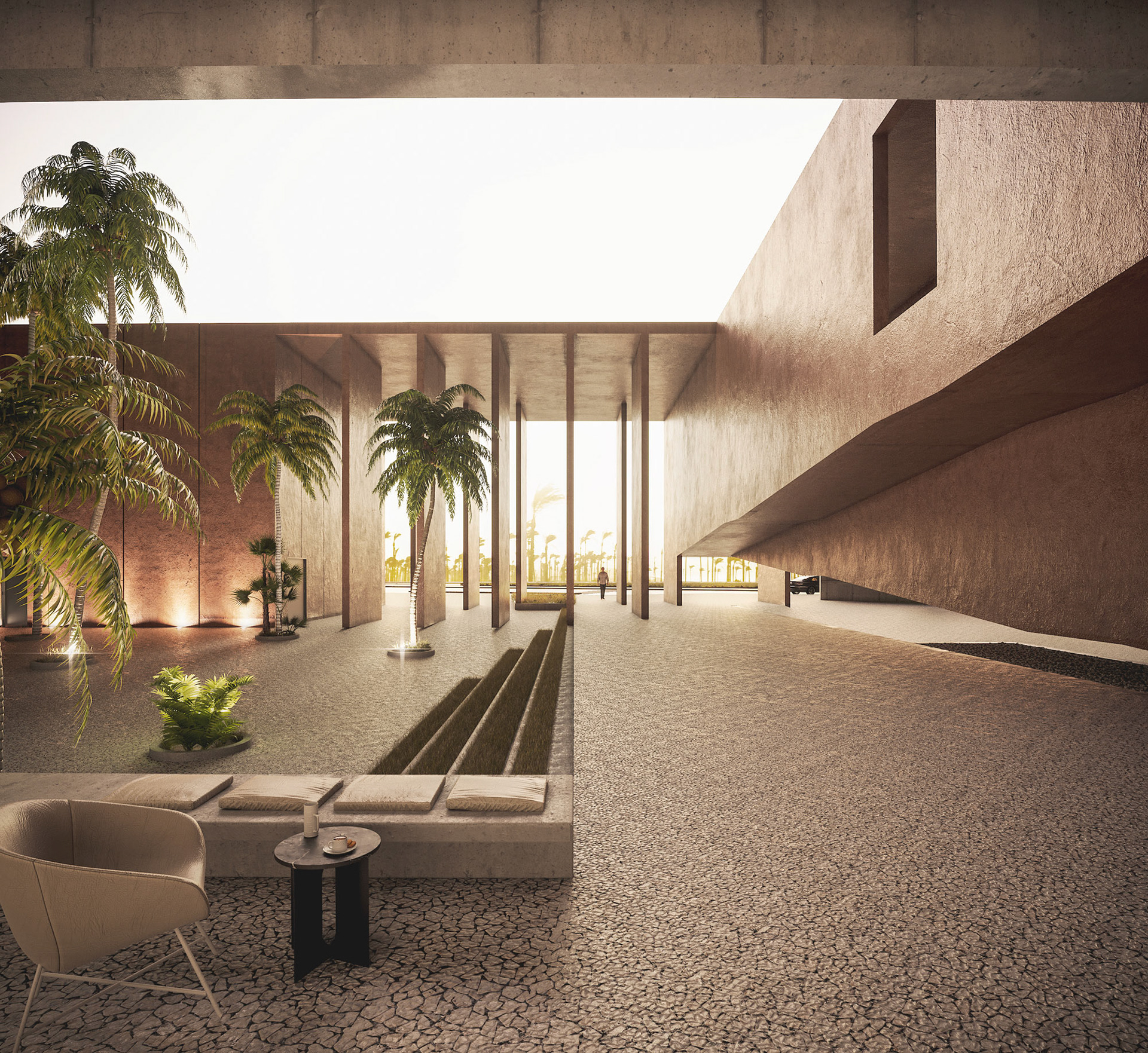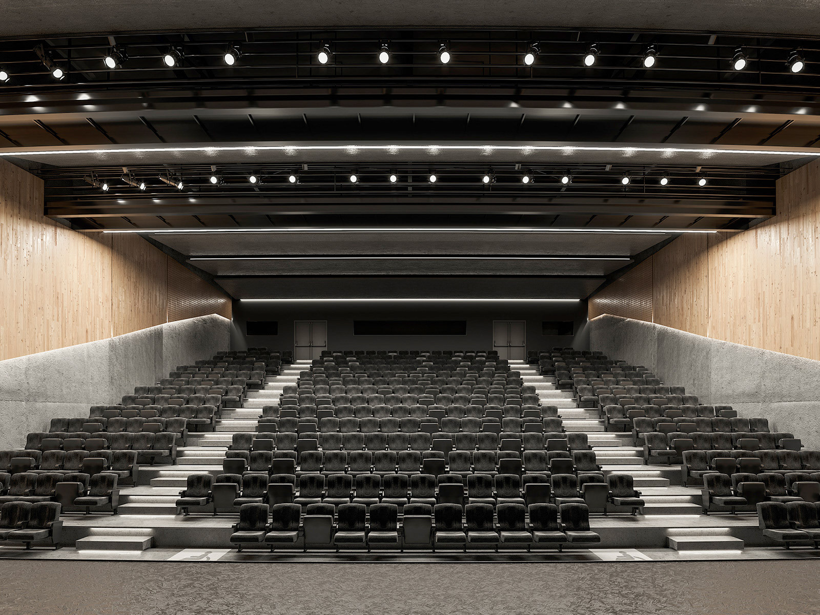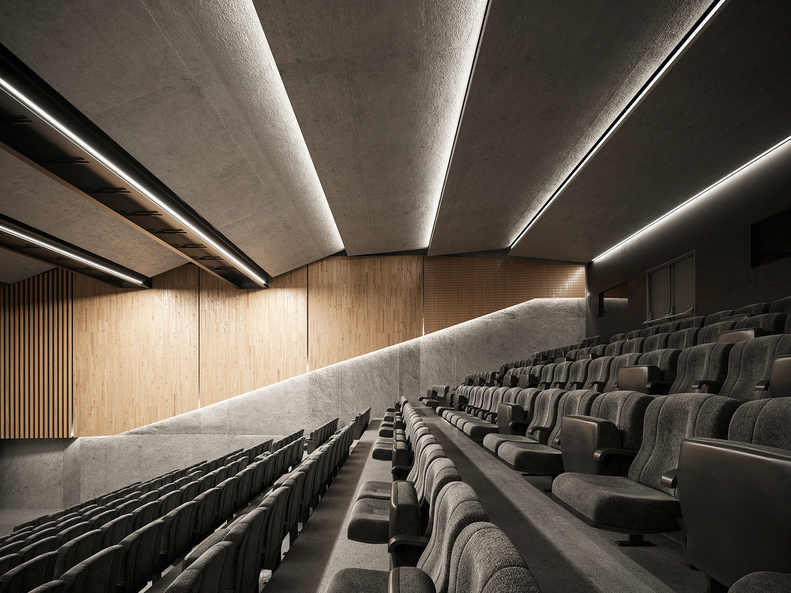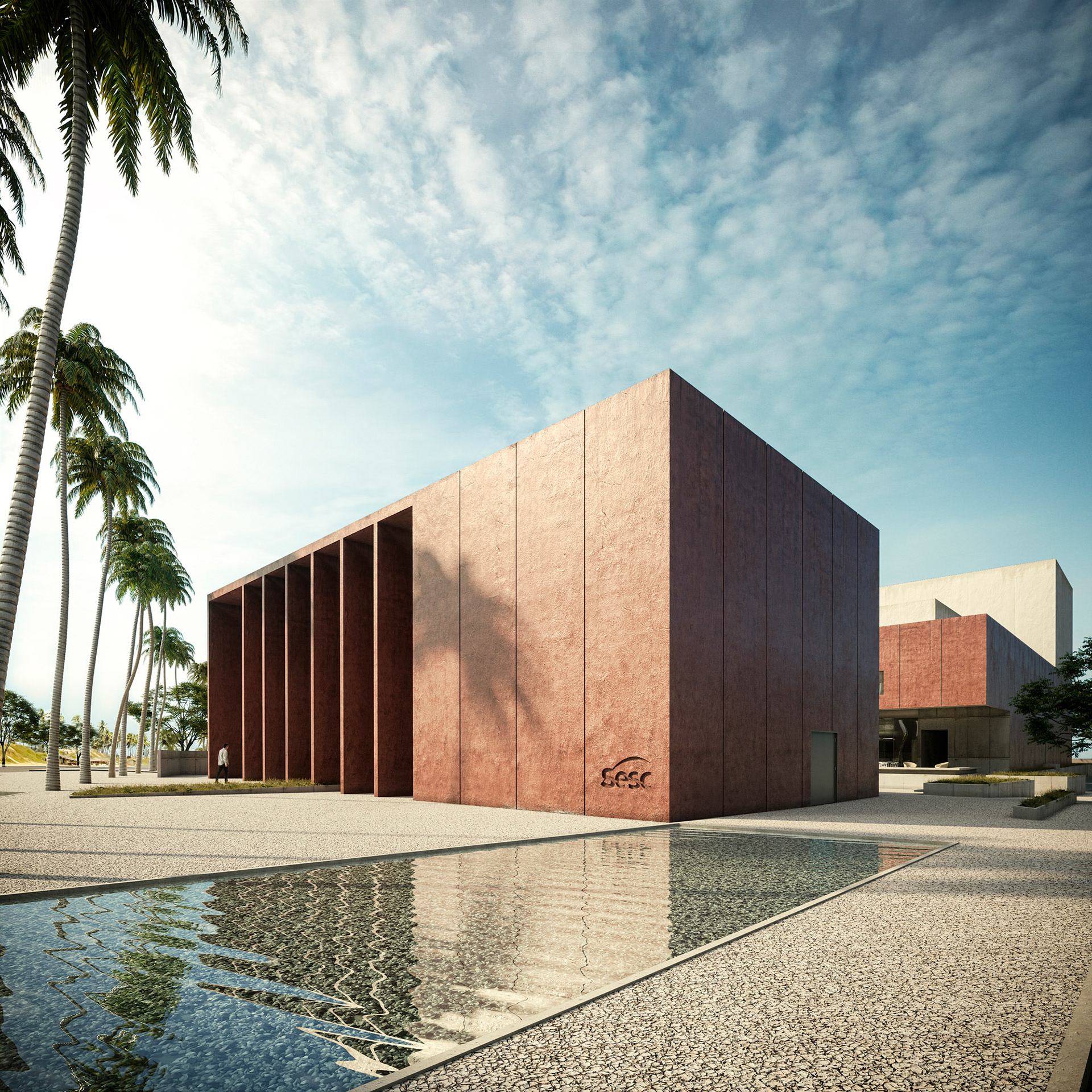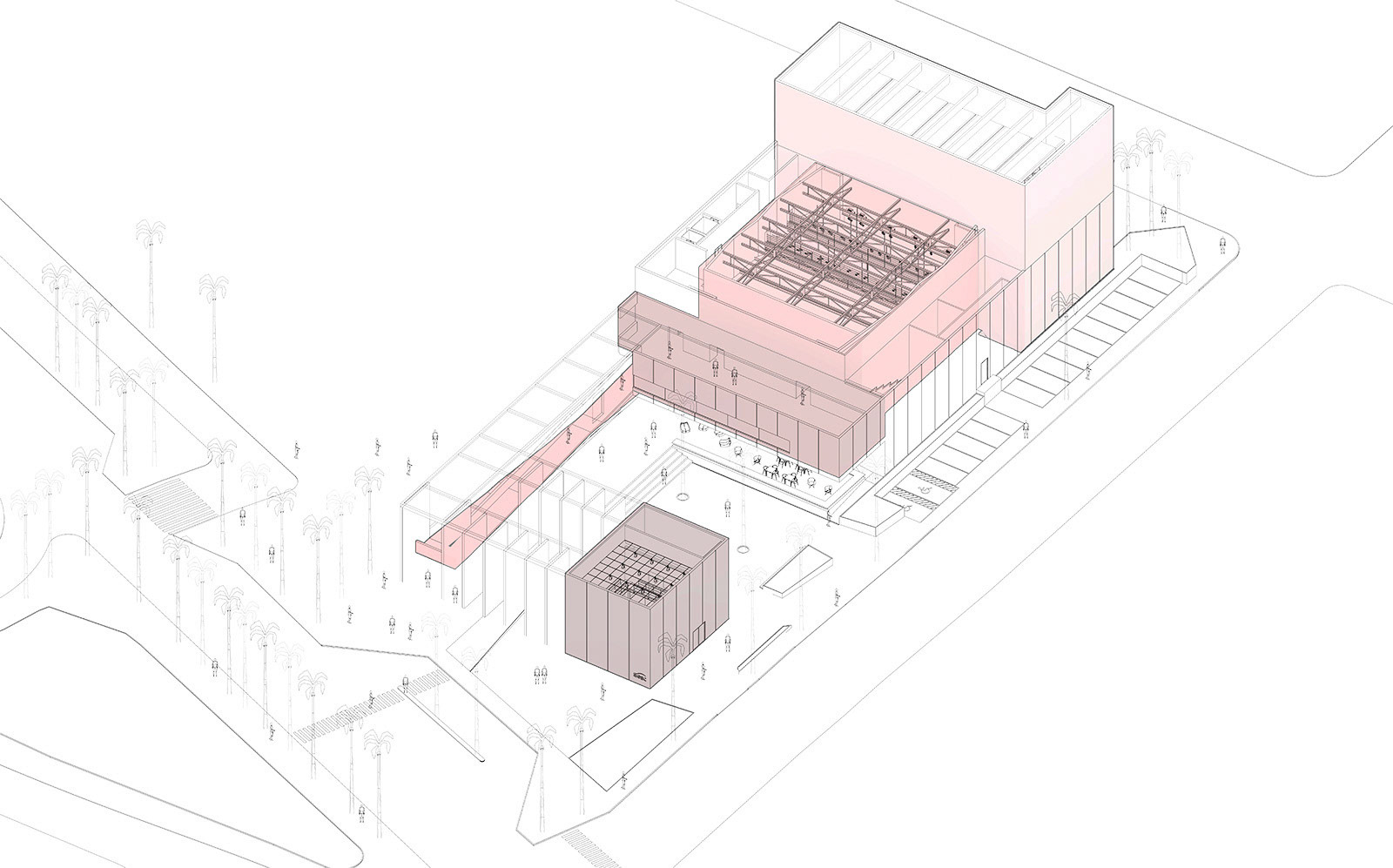 POR A ESTRATÉGIA DE IMPLANTAÇÃO ADOTADA OBJETIVA ATINGIR UMA SOLUÇÃO INTEGRADA ENTRE AS CONSTRUÇÕES EXISTENTES NA QUADRA, A NOVA INTERVENÇÃO ARQUITETÔNICA E AS VIAS DE ACESSO DO ENTORNO IMEDIATO. PARA ATINGIR TAIS CONVENIÊNCIAS, FORAM IDENTIFICADAS DUAS NECESSIDADES PROGRAMÁTICAS QUE DEMANDARIAM DE MAIS ÁREA: O CONJUNTO VOLUMÉTRICO PRINCIPAL DO TEATRO E O BLACK BOX. ASSIM, OS ITENS CITADOS FORAM IMPLANTADOS SEPARADAMENTE NAS DUAS EXTREMIDADES DO TERRENO, PROPORCIONANDO ALÉM DA DEVIDA IMPORTÂNCIA PARA CADA UM DELES, UMA PRAÇA CENTRAL NO LOTE CHAMADA DE “PRAÇA DE BOAS VINDAS”.