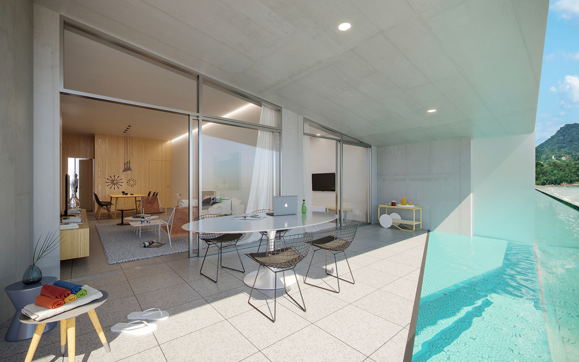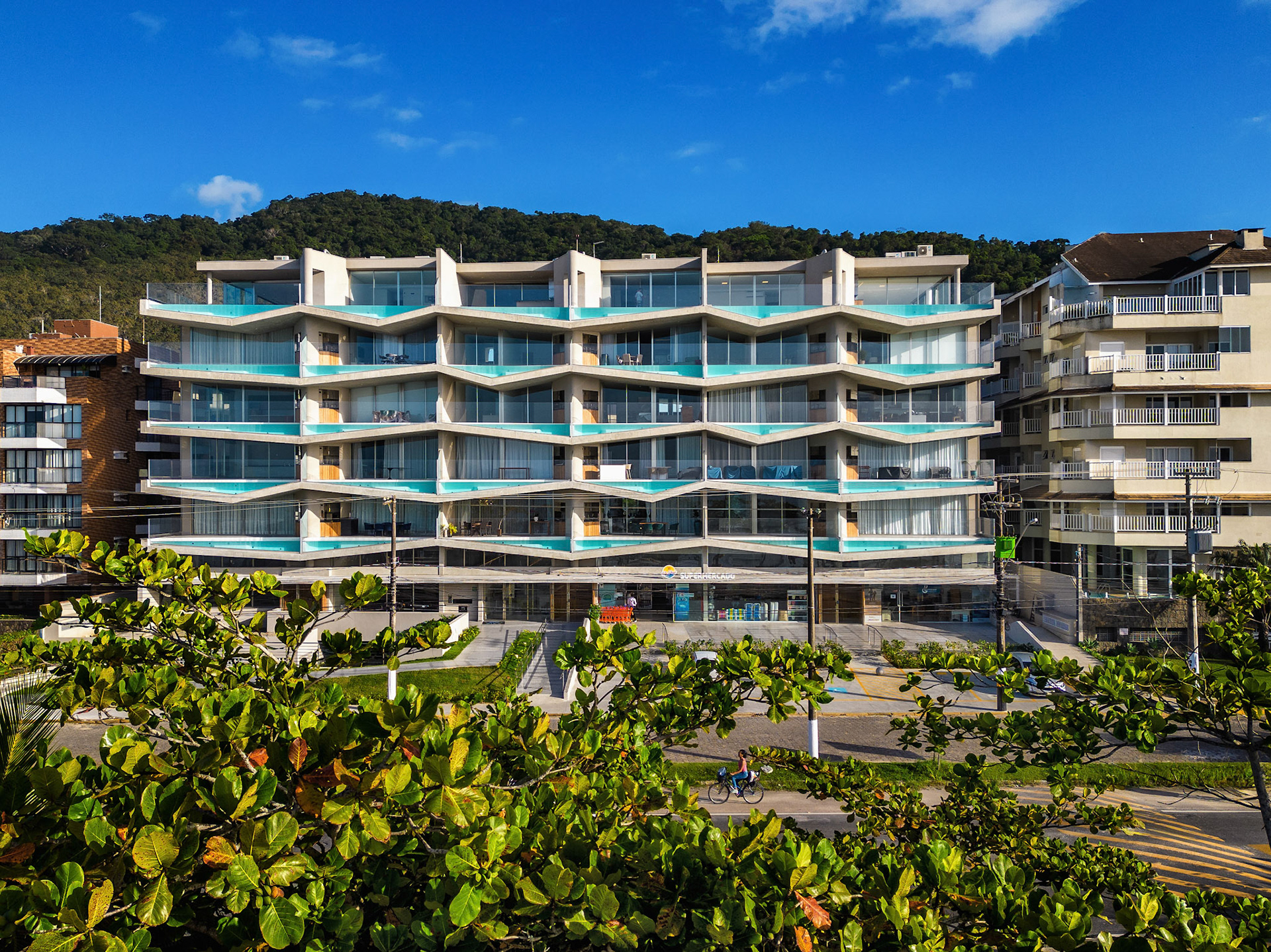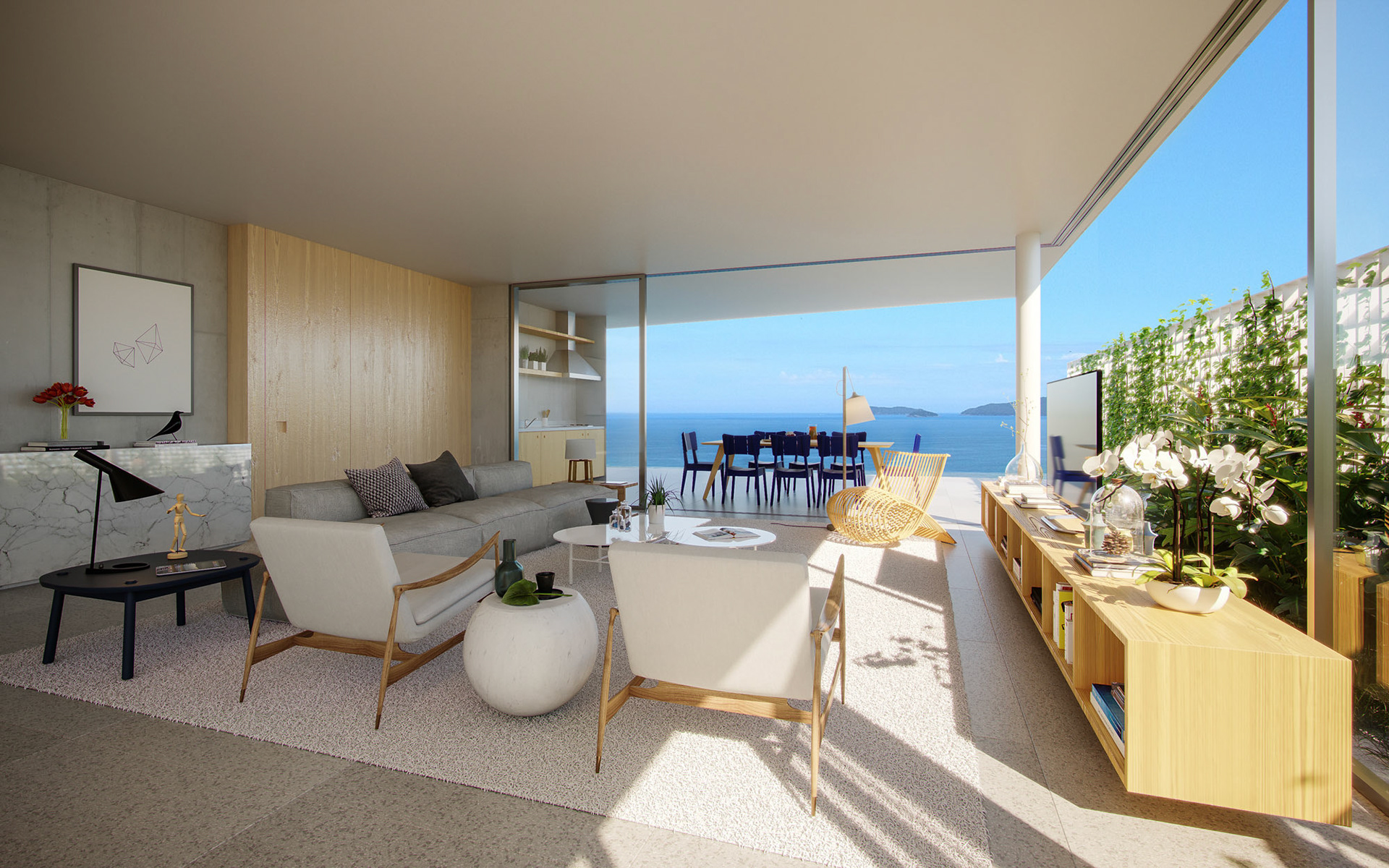 Em cada apartamento, a vista do mar dissolve a linha entre interior e exterior. O desenho é claro, sereno, exige silêncio para se entender: luz que atravessa, vidro que reflete, vento que circula. Sofisticação não é afetação; é clareza no traço, economia no gesto, essência no espaço.