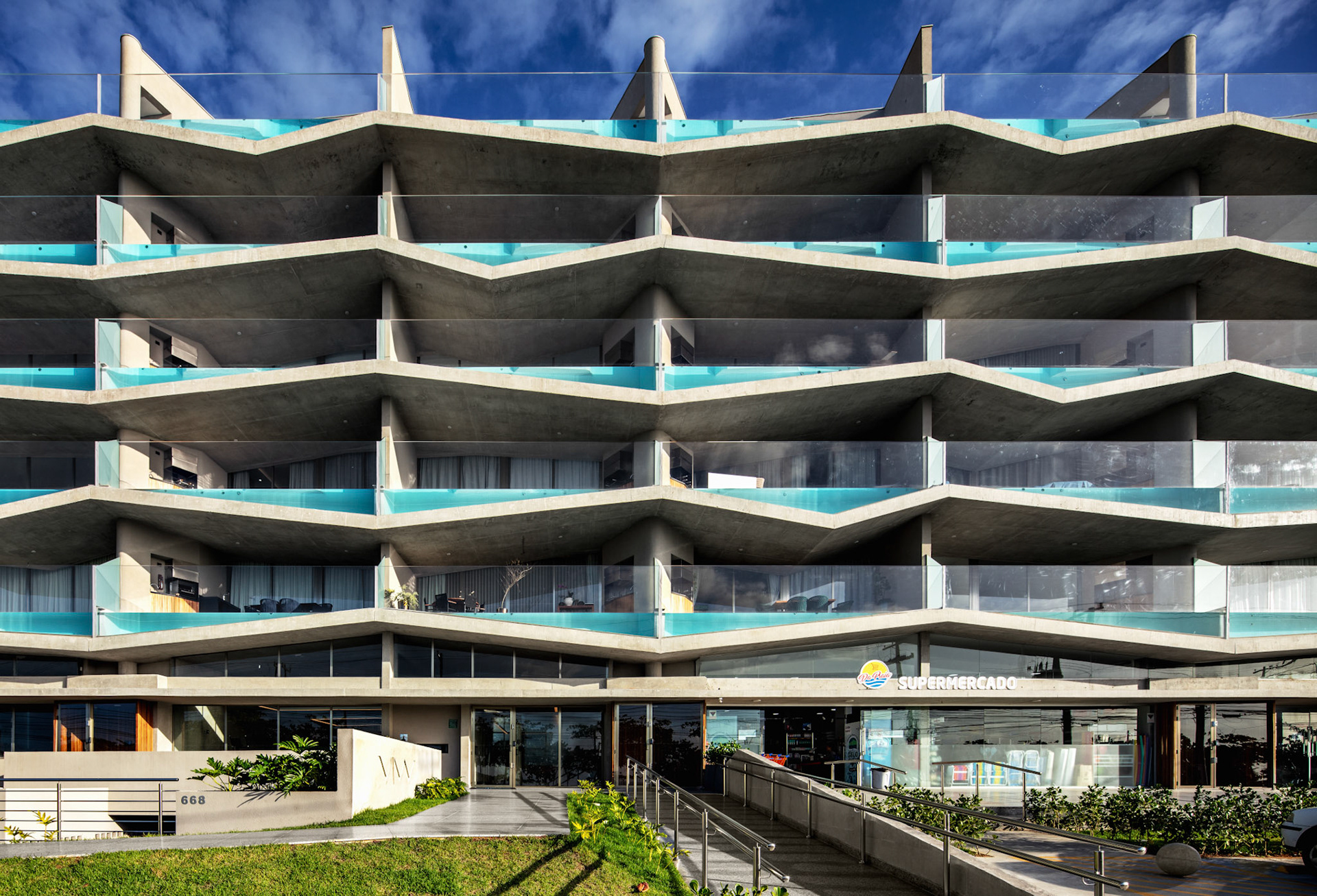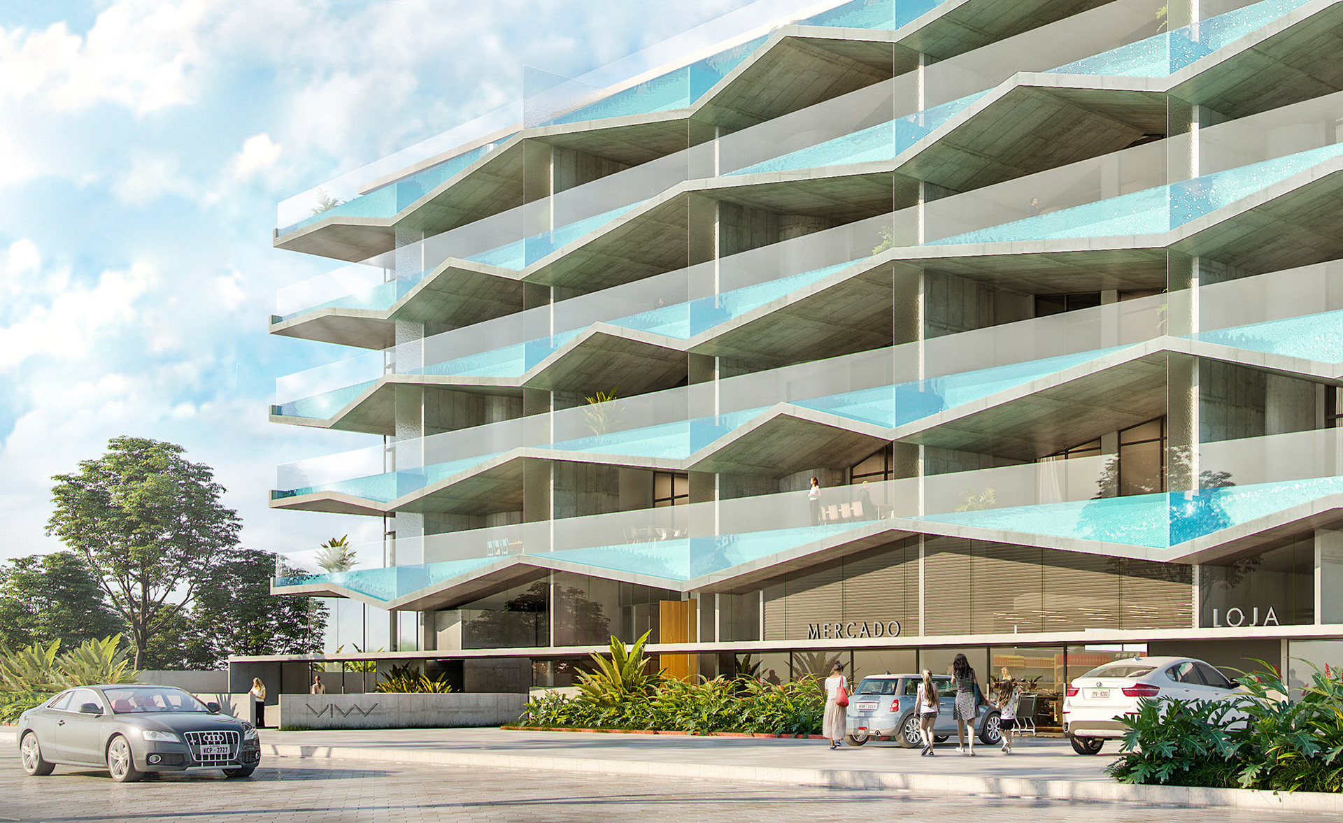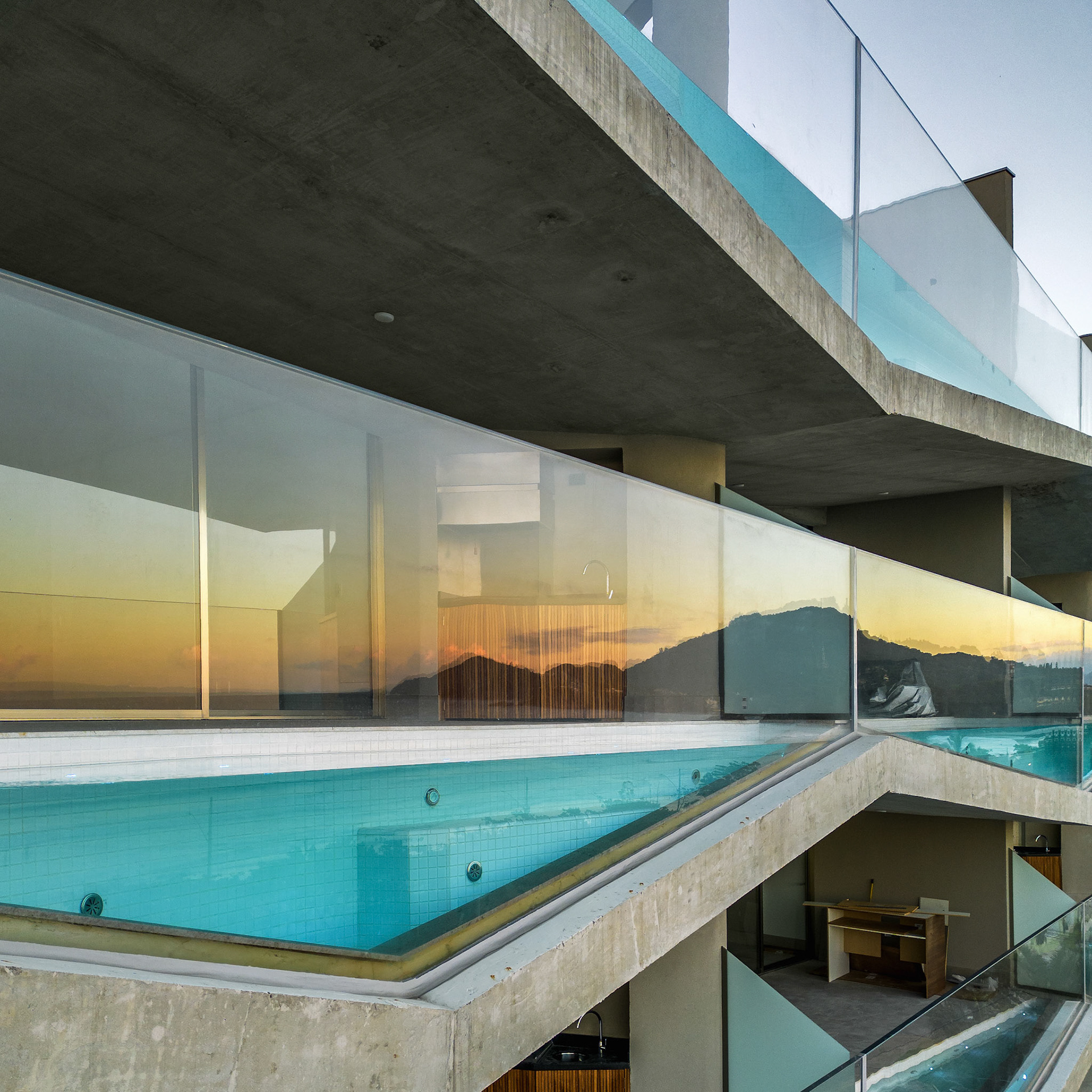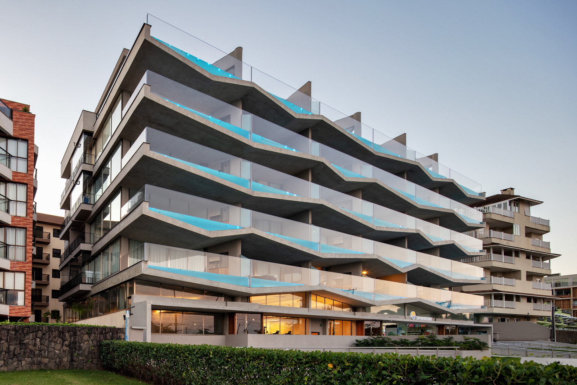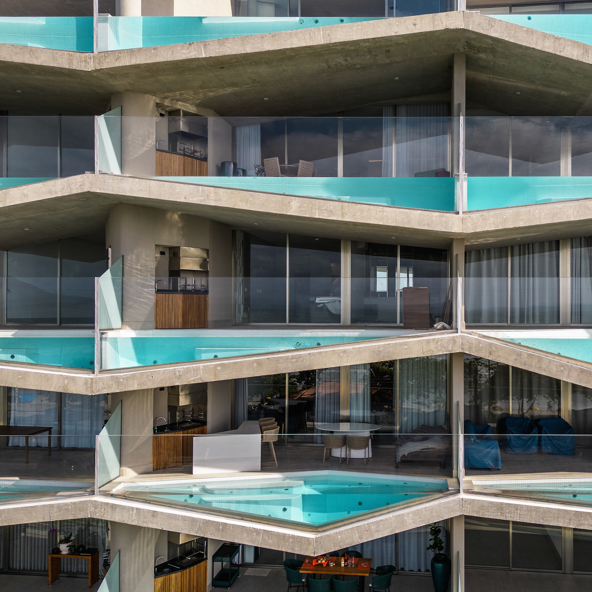 Inspirado pelas sinuosas montanhas de Ubatuba, este edifício nasce do encontro entre lugar e gesto — uma construção que interroga o relevo, o horizonte, a luz. Nas varandas, as piscinas em zigue-zague não se impõem: elas se dobram ao contorno, reinterpretam o movimento da paisagem. O lazer aqui não é ornamento — é gesto; não é espelho d’água apenas — é retirada de horizonte, fragmento do relevo convertido em arquitetura.