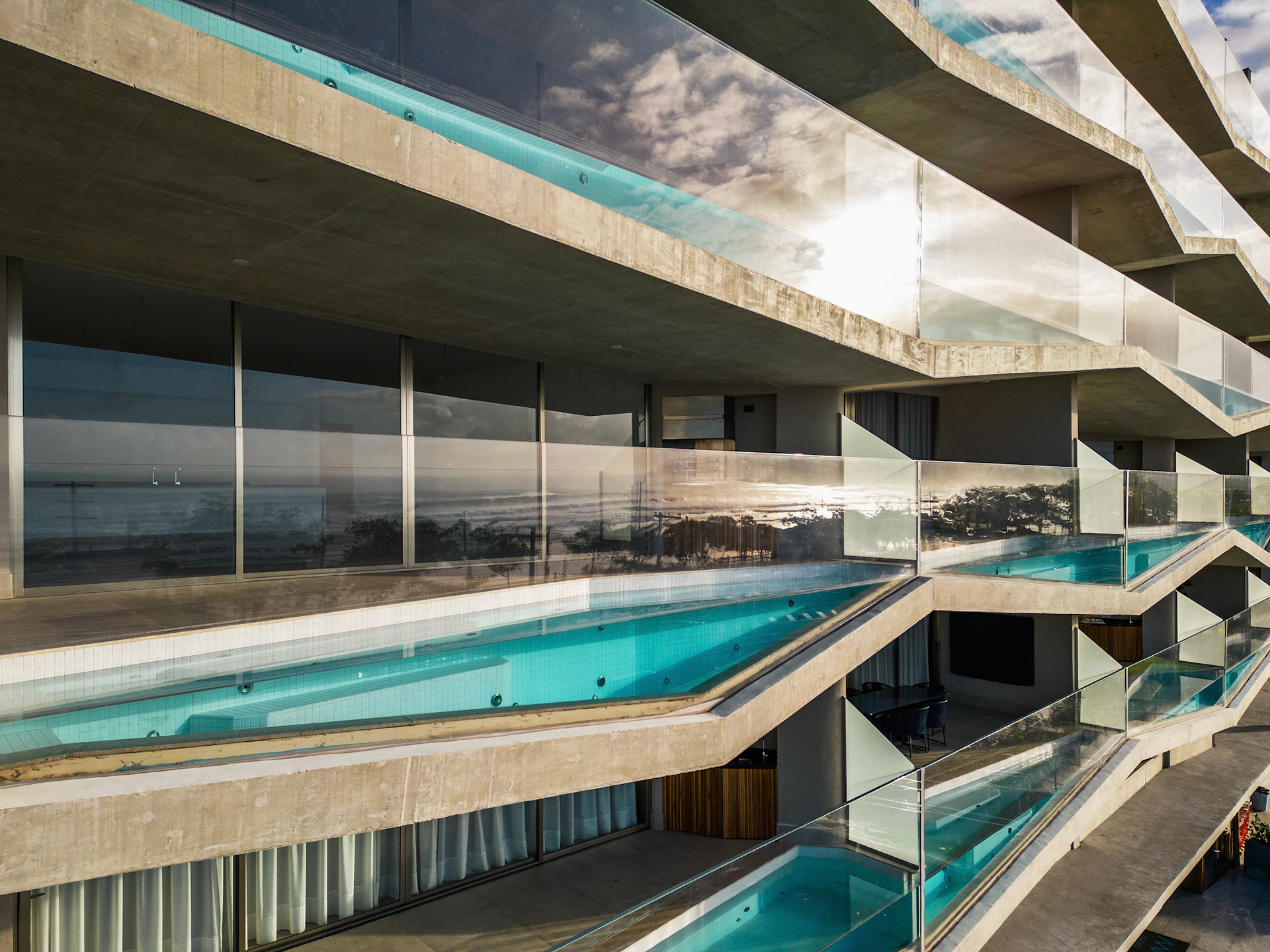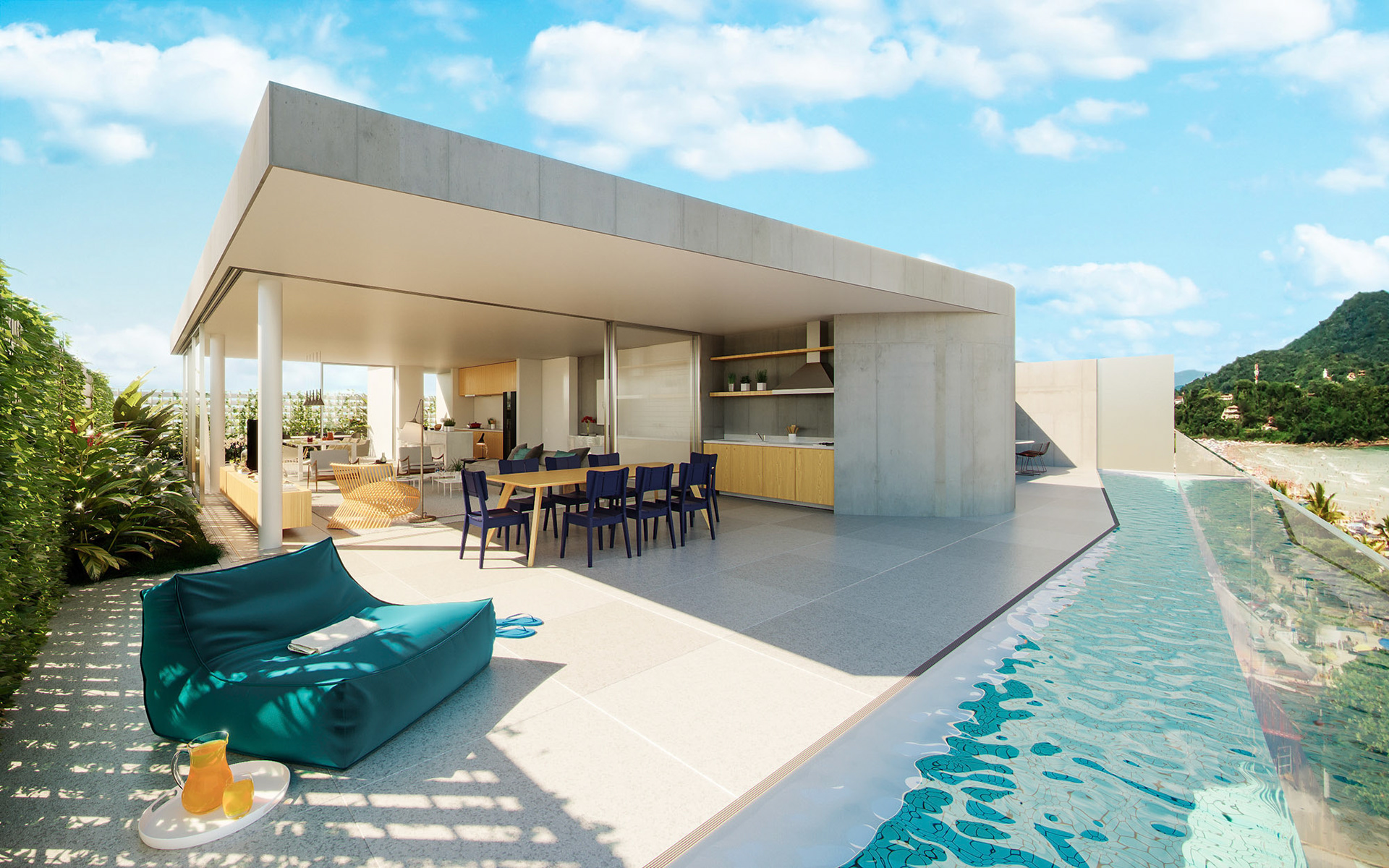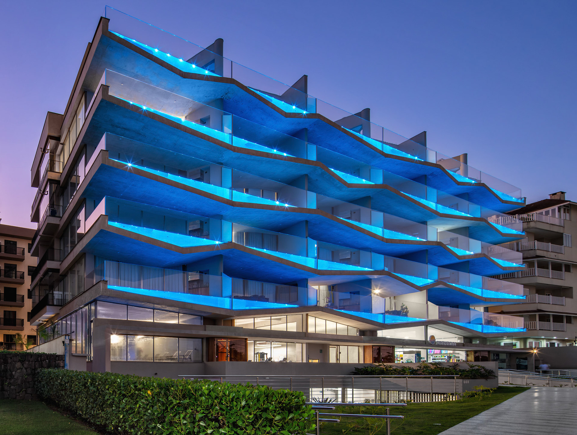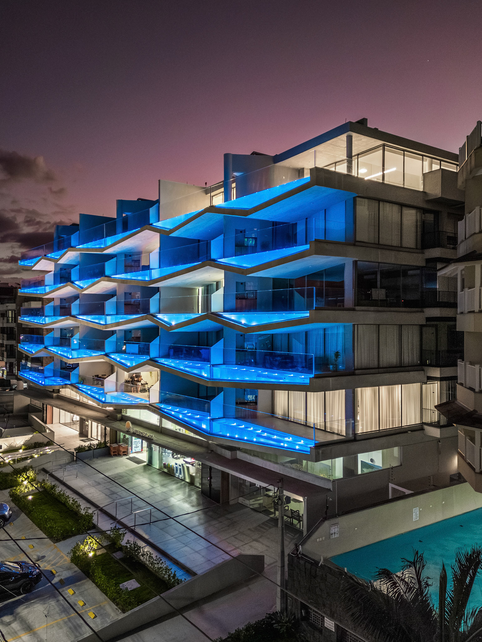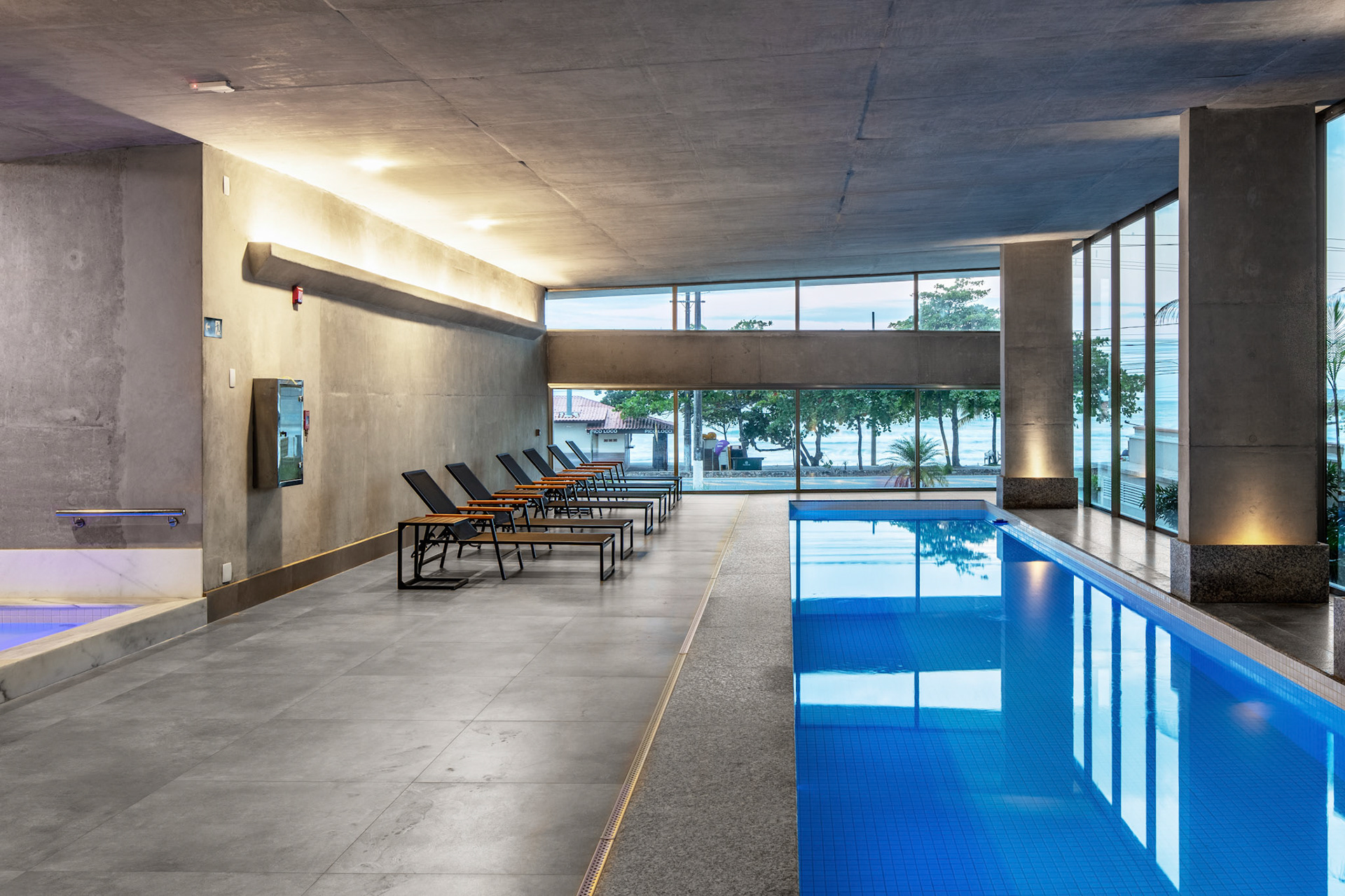 Inspirado pelas sinuosas montanhas de Ubatuba, este edifício nasce do encontro entre lugar e gesto — uma construção que interroga o relevo, o horizonte, a luz. Nas varandas, as piscinas em zigue-zague não se impõem: elas se dobram ao contorno, reinterpretam o movimento da paisagem. O lazer aqui não é ornamento — é gesto; não é espelho d’água apenas — é retirada de horizonte, fragmento do relevo convertido em arquitetura.
