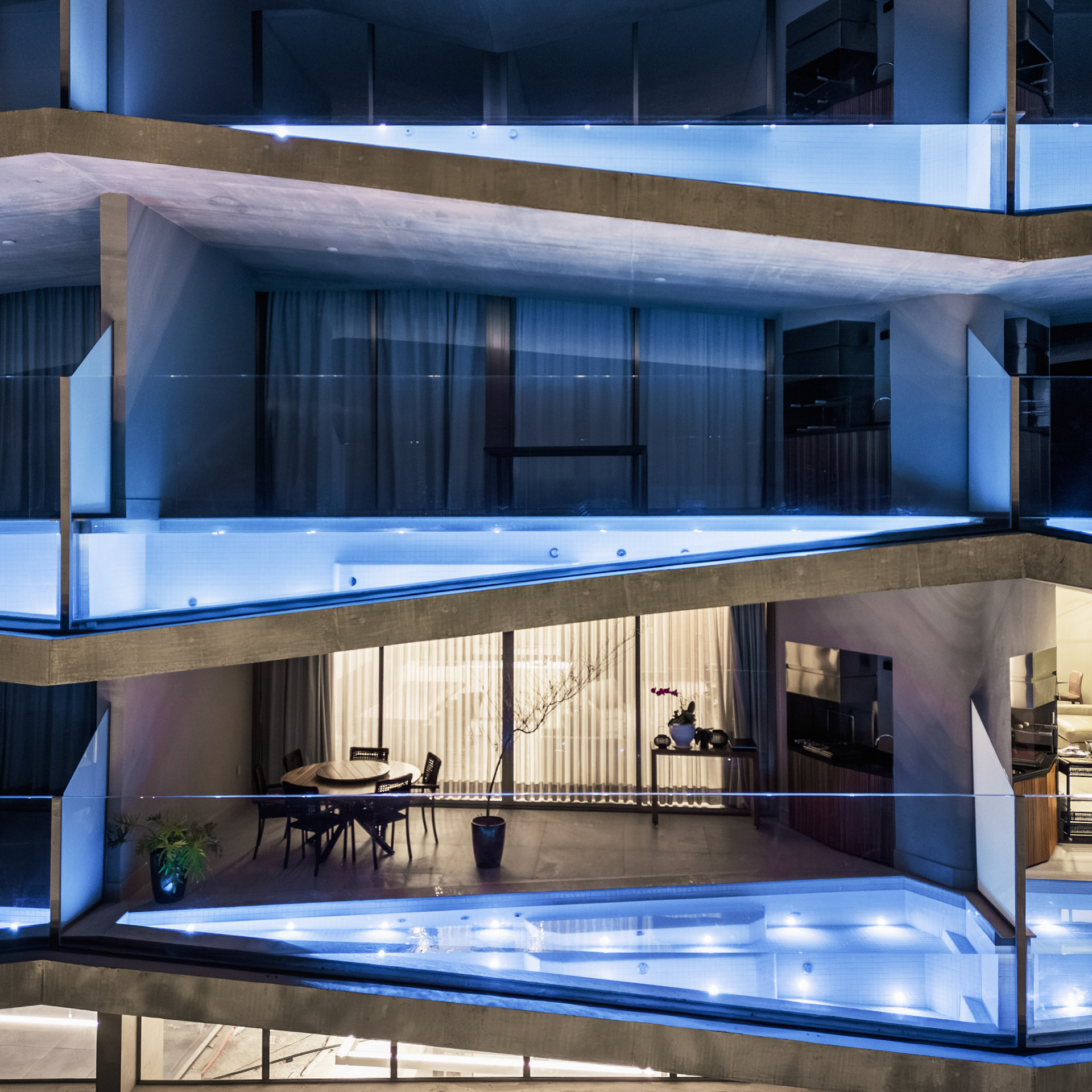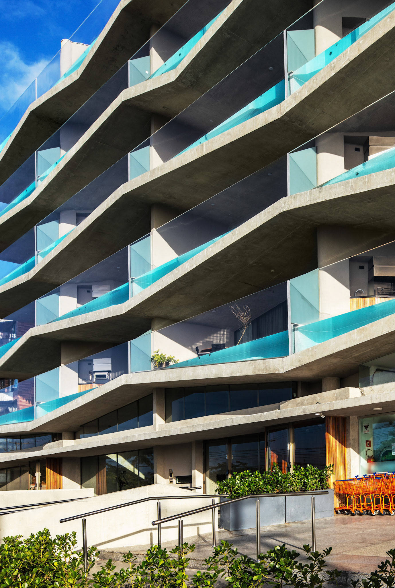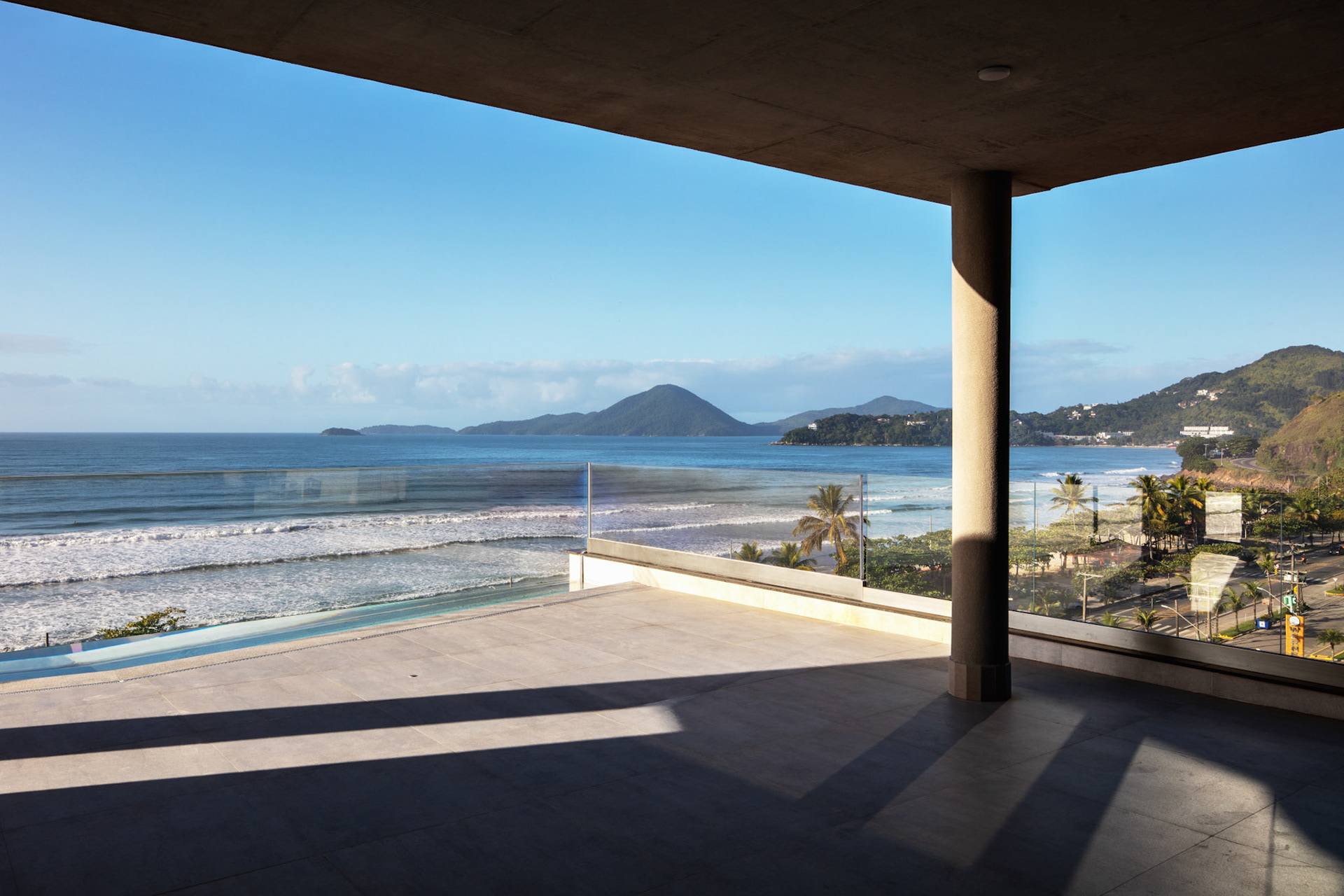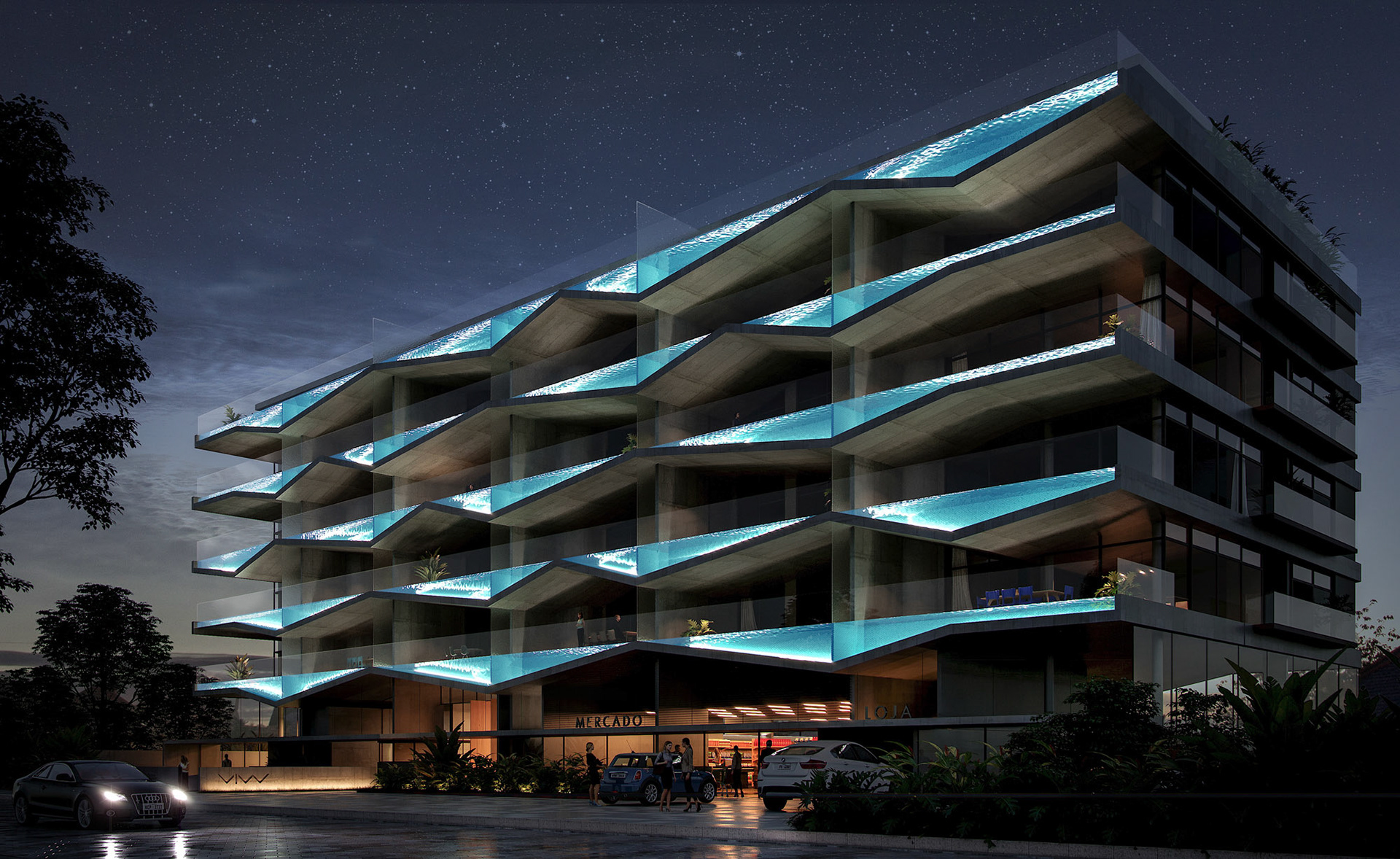 Inspirado pelas sinuosas montanhas de Ubatuba, este edifício nasce do encontro entre lugar e gesto — uma construção que interroga o relevo, o horizonte, a luz. Nas varandas, as piscinas em zigue-zague não se impõem: elas se dobram ao contorno, reinterpretam o movimento da paisagem. O lazer aqui não é ornamento — é gesto; não é espelho d’água apenas — é retirada de horizonte, fragmento do relevo convertido em arquitetura.