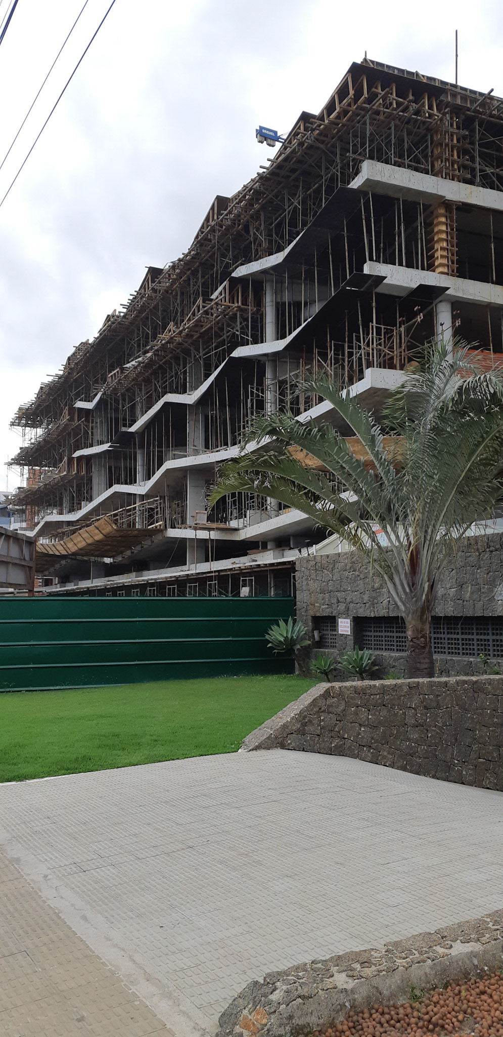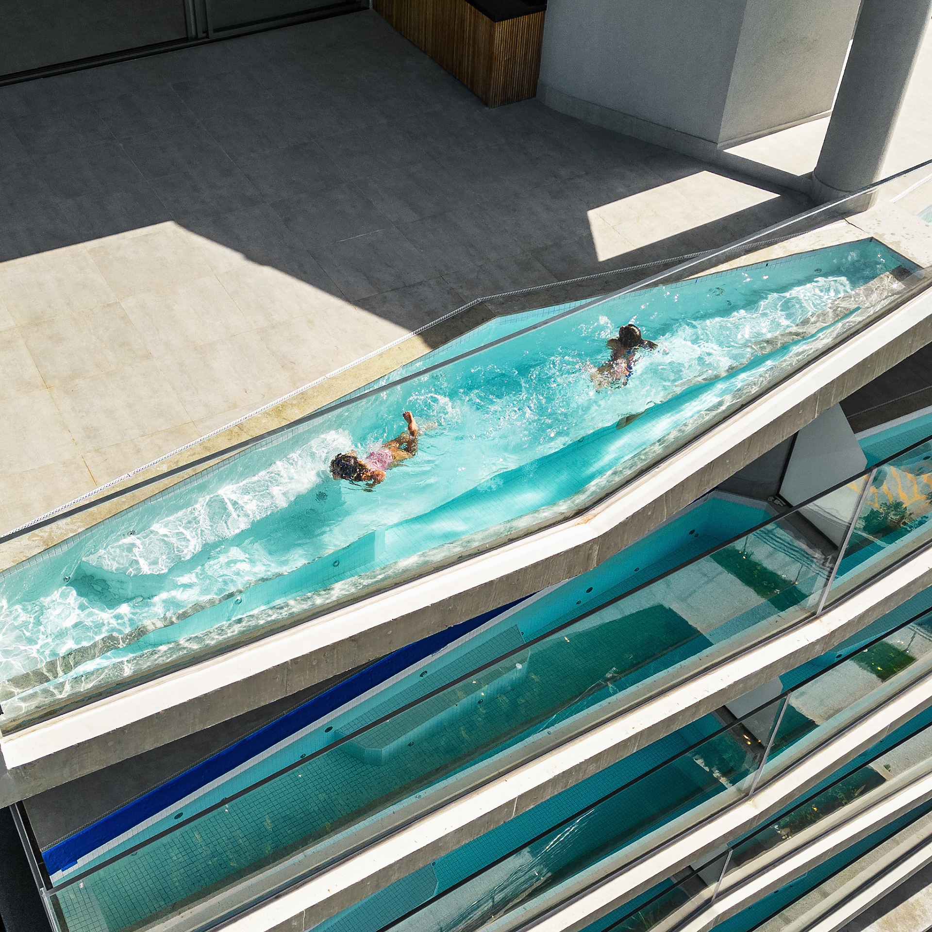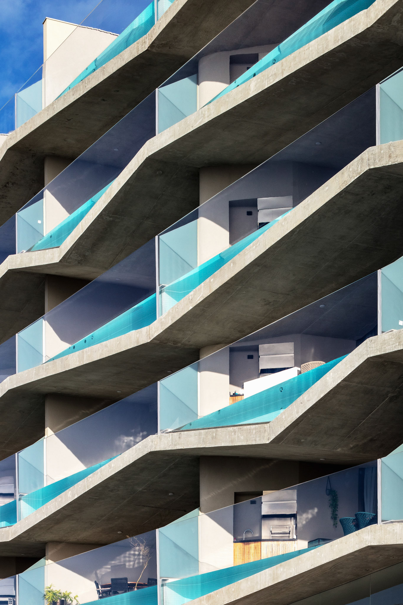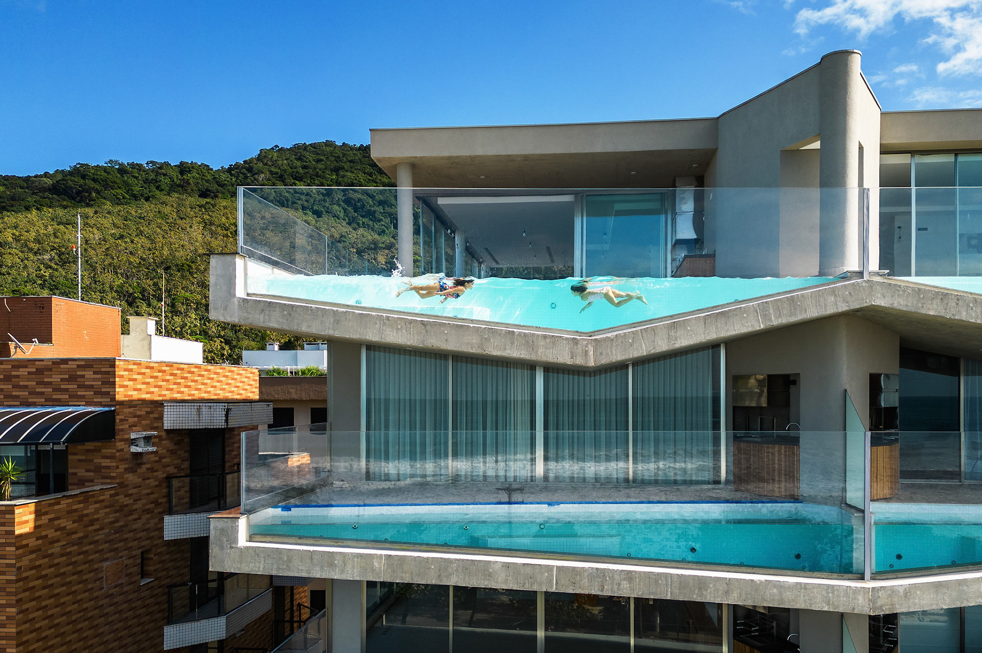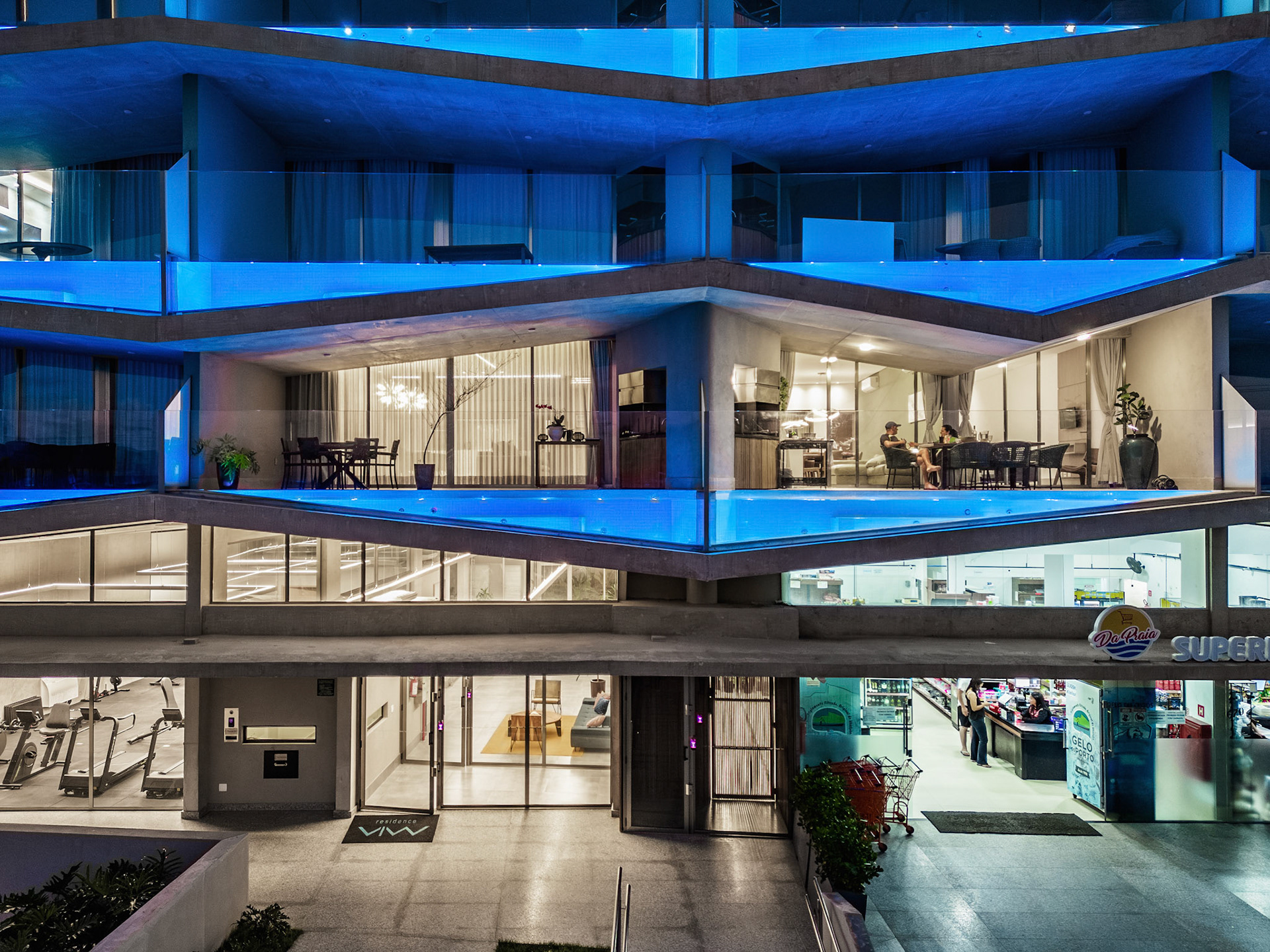Inspirado pelas sinuosas montanhas de Ubatuba, este edifício nasce do encontro entre lugar e gesto — uma construção que interroga o relevo, o horizonte, a luz. Nas varandas, as piscinas em zigue-zague não se impõem: elas se dobram ao contorno, reinterpretam o movimento da paisagem. O lazer aqui não é ornamento — é gesto; não é espelho d’água apenas — é retirada de horizonte, fragmento do relevo convertido em arquitetura.